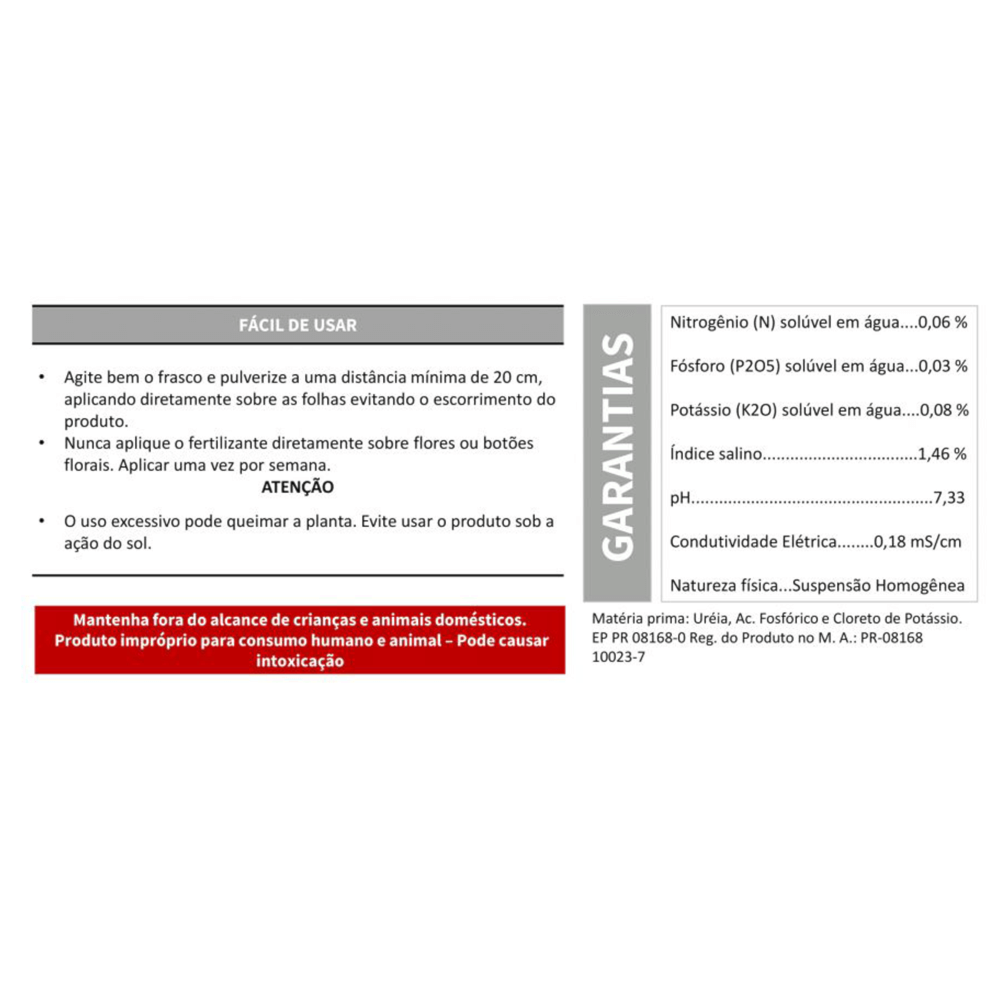 Agite bem o frasco e pulverize a uma distância mínima de 20cm, aplicando diretamente sobre as folhas evitando o escorrimento do produto. Utilize-o uma vez por semana, pois o uso excessivo pode queimar a planta.