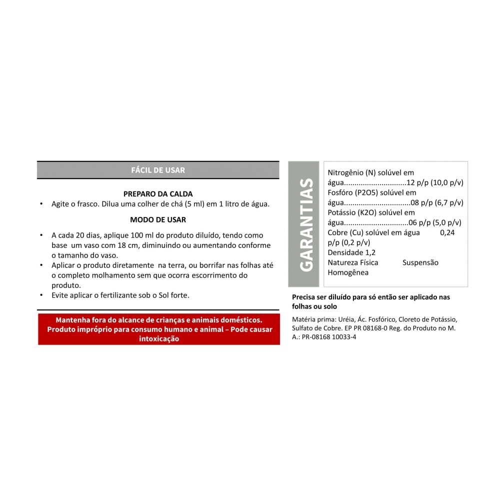 Detalhes do Produto Fórmula ideal para desenvolvimento de folhagens, ressaltando a cor verde em samambaias, avencas, chifres de veado, rendas portuguesas, entre outros e brotações, mantendo suas folhagens sempre saudáveis, fortes e bonitas. Pode ser utilizado em outros tipos de plantas.