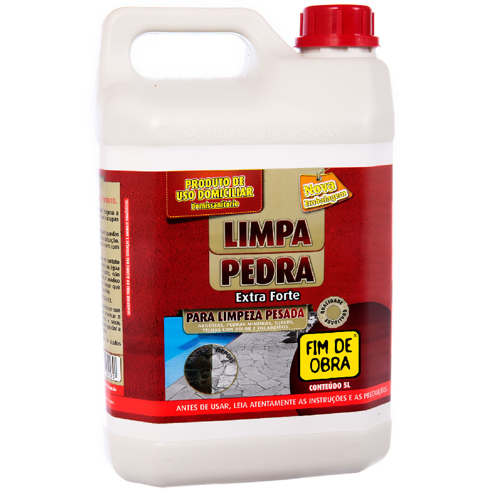 O Limpa Pedra 5L da marca Fim de Obra é um poderoso aliado na limpeza de diversos tipos de superfícies após obras e reformas. Sua fórmula concentrada remove com facilidade cimento, rejunte, manchas de tinta, ferrugem e outras sujeiras incrustadas em: