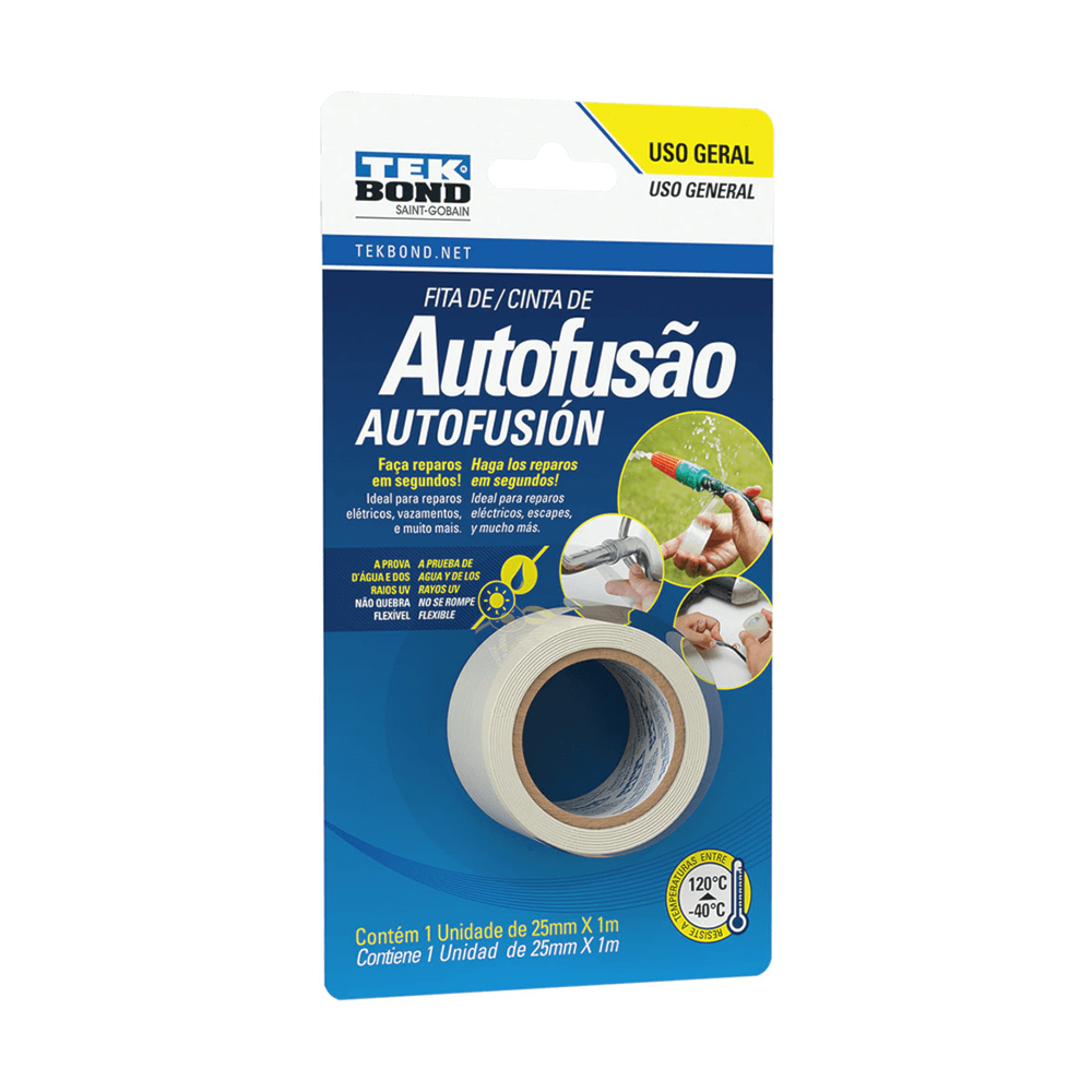 A Fita Super Tape de Autofusão Tekbond é uma fita multiuso para diversos reparos domésticos. Produzida sem nenhum tipo de adesivo, ela simplesmente adere a si mesma em um processo de ‘autofusão’, promovendo um reparo eficiente, a prova de água, resistente aos raios UV, sal, químicos corrosivos e óleos.