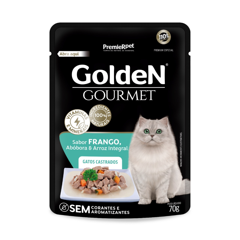 Água, carne de frango, carne mecanicamente separada de frango, pescoço de frango sem pele, fígado de frango, plasma suíno em pó, farelo de arroz desengordurado, proteína isolada de soja, amido de milho, óleo de peixe, goma guar, arroz integral, abóbora, cloreto de sódio (sal comum), cloreto de potássio, carbonato de cálcio, fosfato bicálcico, taurina, L-carnitina, vitamina A, vitamina B12, vitamina C, vitamina D3, vitamina E, vitamina K3, ácido fólico, ácido pantotênico, biotina, cloreto de colina, niacina, piridoxina, riboflavina, tiamina, cobre aminoácido quelato, ferro aminoácido quelato, iodeto de potássio, manganês aminoácido quelato, selênio metionina, zinco aminoácido quelato.