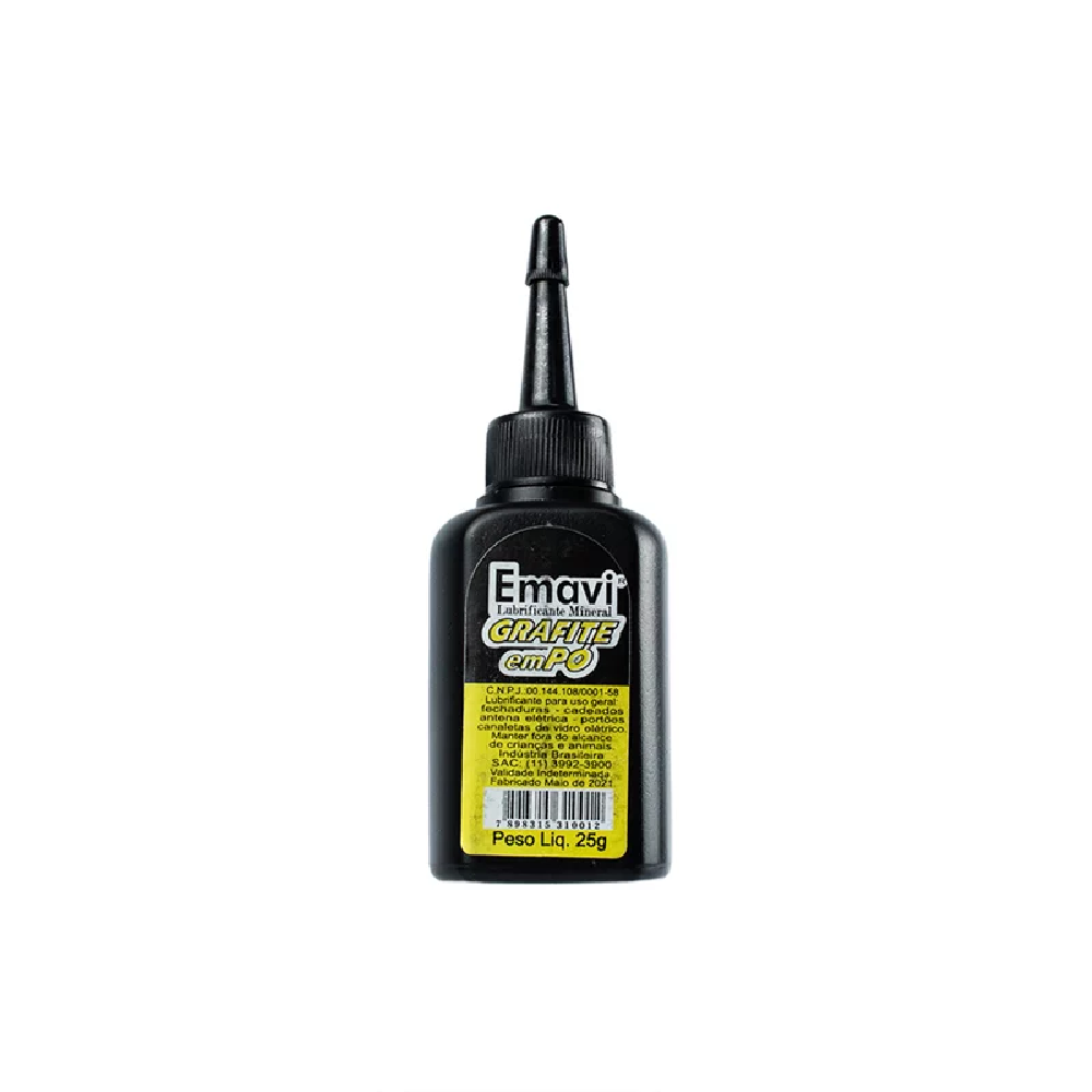 Grafite em Pó Uso Geral 25g Emavi: A solução ideal para lubrificação à seco de diversos mecanismos, garantindo um funcionamento suave, silencioso e duradouro, com proteção contra desgaste e corrosão!