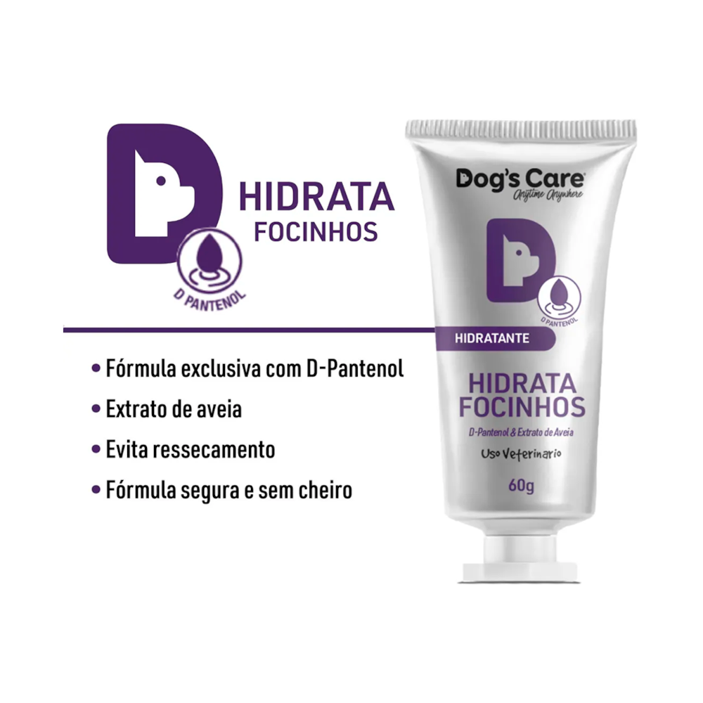 Descrição do produtoHidratante Hidrata Focinho com D-Pantenol Dog's Care Bisnaga 60g foi desenvolvido com uma formulação suave e segura com adição especial de D-Pantenol e extrato de aveia, para promover uma hidratação mais profunda da pele e do focinho dos pets, regiões sujeitas e ressecamento. Benefícios - Fórmula exclusiva com D-Pantenol e extrato de aveia promovendo uma hidratação profunda da cartilagem