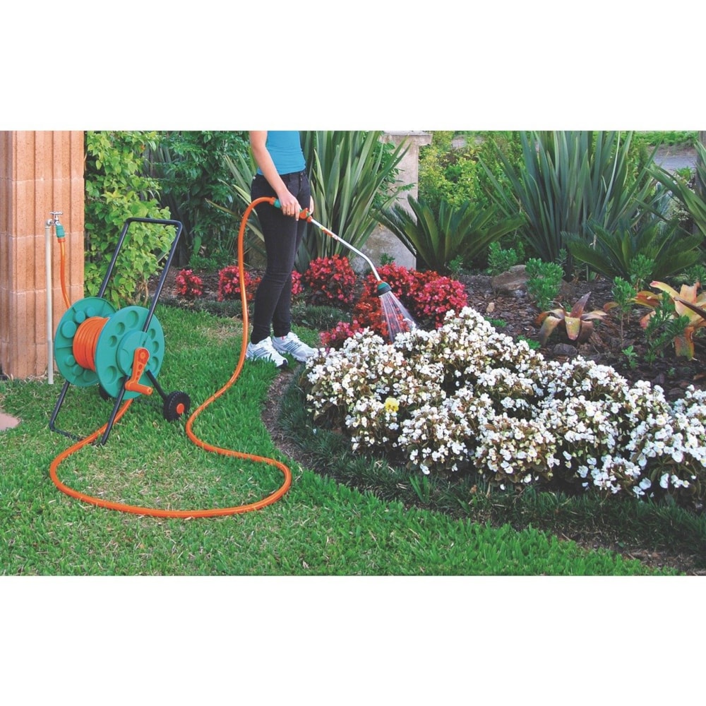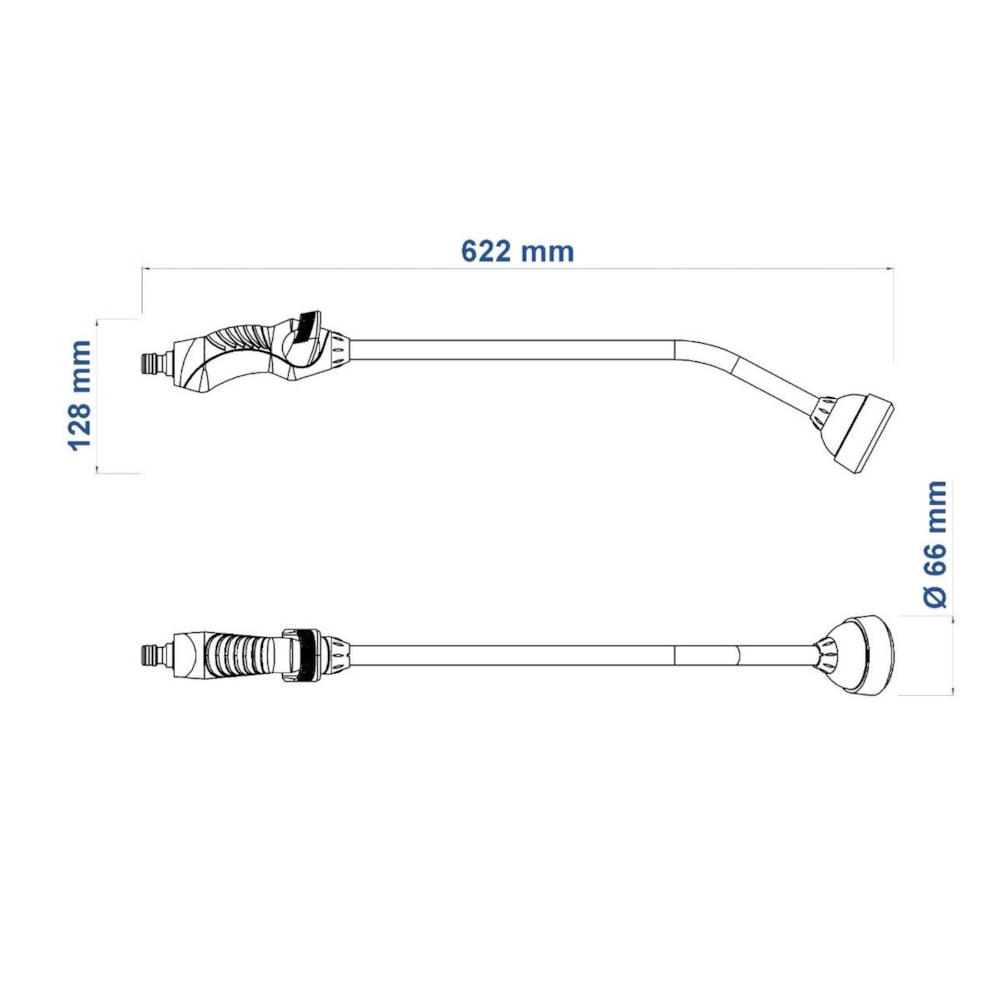 Cabo longo, ideal para irrigação de folhagens densas e vasos de flores em altura.