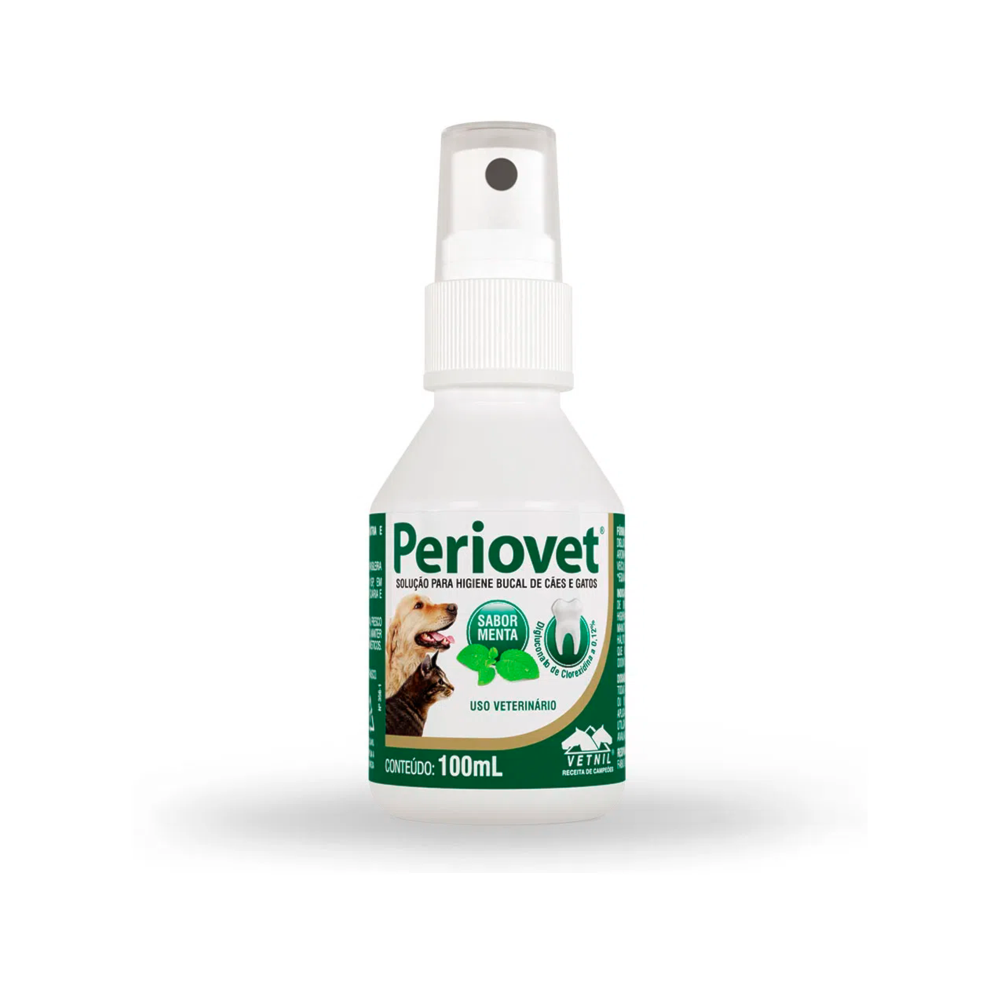 Periovet é uma solução a base de Digluconato de Clorexidina a 0,12% para higienização oral de cães e gatos