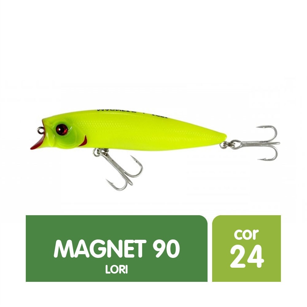 Detalhes do Produto A isca artificial Lori Magne 90 possui um sistema magnético interno que modifica o centro de gravidade da isca durante o arremesso. Possui imã interno de neodímio, mais forte e eficiente que os tradicionais imãs de ferrite. Produzida em plástico ABS e vedada com sistema que garante plena fusão do material. Possui pintura em tinta automotiva. É equipada com argolas e pitões em aço inox, garatéias reforçadas 3x e olhos holográficos.