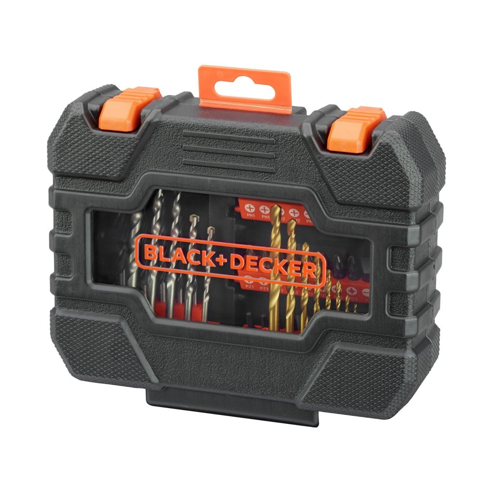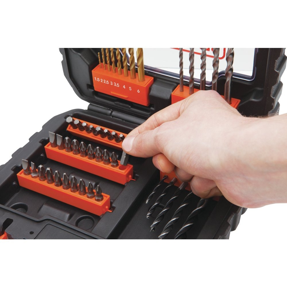 Jogo de furar / parafusar com 50 peças; inclui: 1 maleta; 5 brocas de 3 pontas para madeira; 5 brocas para concreto; 8 brocas para metal; 30 bits para parafusar de 25mm (diversos); ! extensor magnético e 1 escariador.