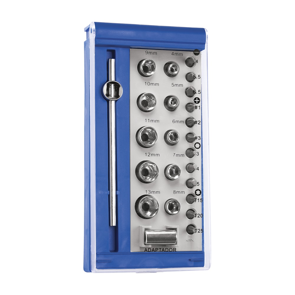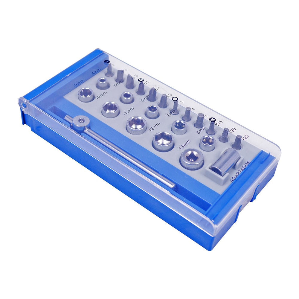 1 Adaptador de 1/4", 12 ponteiras: 3 ponta chata: 4, 5.5, 6.5 mm, 3 ponta cruzada: nr.1, 2, 3; 3 ponta hexagonal: 3, 4, 5 mm, 3 ponta trafix: T15, T20, T25.