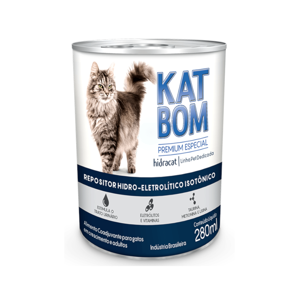 KATBOM HIDRACAT é um alimento coadjuvante, líquido, recomendado para hidratação e reposição eletrolítica. Recomendado para gatos em crescimento e adultos de qualquer raça. Por ser a base de carne é uma bebida perfeita para estimular a ingestão de água em animais sob estresse, principalmente em recuperação de doenças, enterites, problemas renais, processos cirúrgicos, bem como para animais idosos que tendem a ingerir menos líquido do que necessitam. O uso do Katbom Hidracat promoveu, devido ao aumento do consumo de líquido, maior produção de urina, menor densidade urinária, redução do pH da urina e aumento na relação ingestão de líquido para matéria seca.
