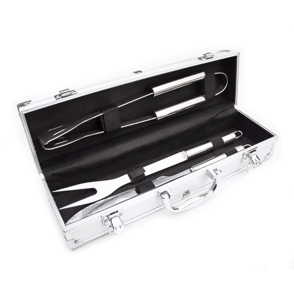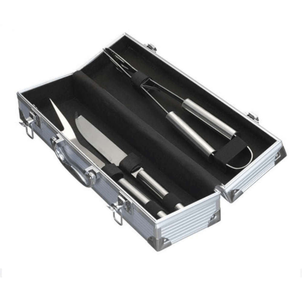 O Kit Para Churrasco da Wincy é organizado em uma linda maleta de alumínio, dentro segue com 3 peças: 1 faca, 1 garfo para assados e 1 pegador, peças feitas em aço inoxidável. O Kit de Churrasco junta estilo e qualidade em suas comemorações com amigos e a família e é um excelente presente pela beleza das peças, inclusive a maleta de alumínio que possui um espaço em inox na lateral para gravar algum texto, como nome, logomarca, etc... Esse jogo de churrasco possui peças que são essenciais no preparo de um bom churrasco com muita praticidade e estilo.