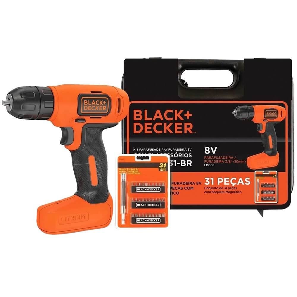 Kit Parafusadeira/Furadeira 3/8" 10mm Bivolt a Bateria 8V com 31 Acessórios e Maleta LD008K31 da Black+Decker é uma ótima opção para quem busca praticidade, com design ergonômico e compacto que facilita a utilização.