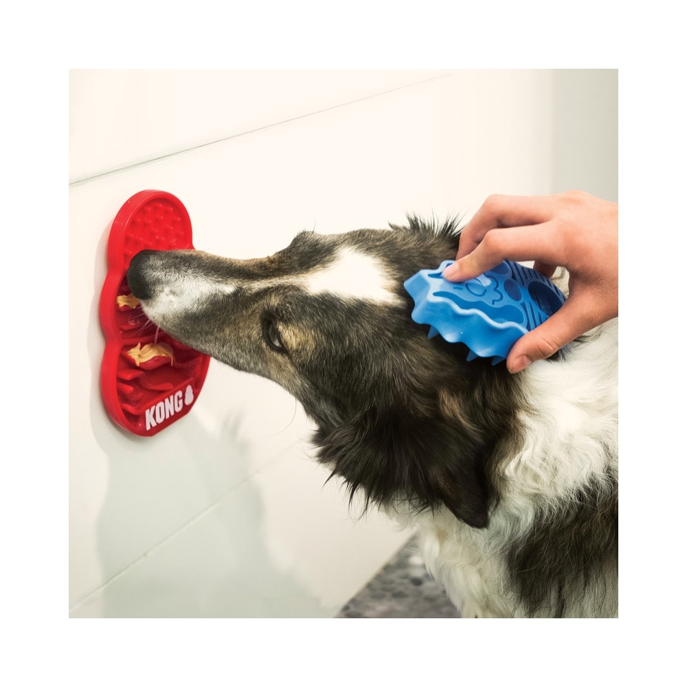 O Kong Licks é um produto com base de plástico que contém 2 (duas) ventosas que aderem à qualquer superfície lisa.