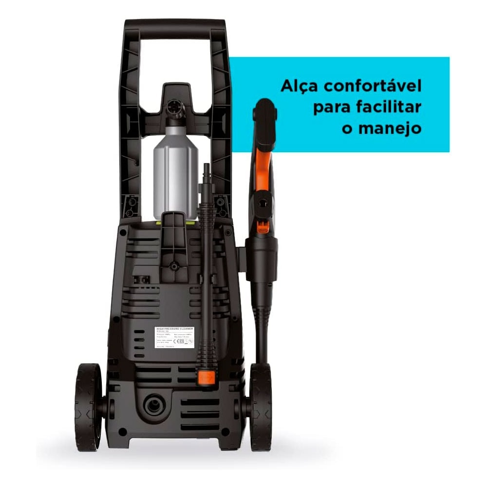 Equipada com uma alça e rodas, a lavadora é fácil de transportar e manusear, permitindo que você alcance todas as áreas que precisam ser limpas. Seu design compacto e funcional torna o uso ainda mais prático, garantindo que você possa guardar o equipamento de forma conveniente após o uso.