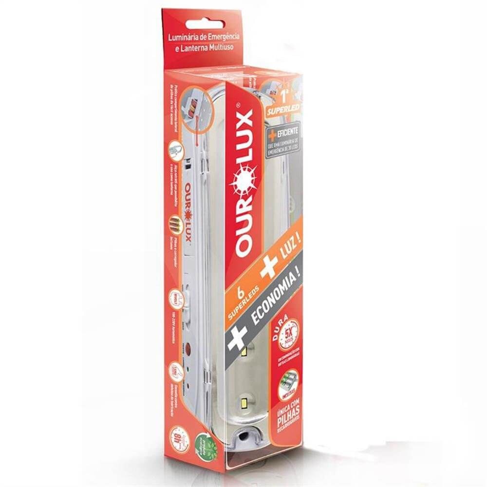 Agora com SUPERLEDS, as novas Luminárias de Emergência Ourolux funcionam com pilhas recarregáveis, o que garante uma vida útil 5 vezes maior que as outras. Seus SUPERLEDS proporcionam mais fluxo luminoso, com metade do consumo energético em relação aos modelos anteriores. Leves e compactas, possuem compartimento lateral com carregador de pilhas acoplado, podem ser utilizadas como lanterna.