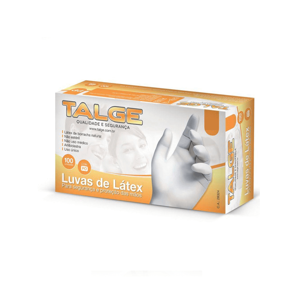 As Luvas Talge de Látex de Segurança e Proteção com Talco são feitas de borracha natural, não é estéril e nem de uso médico. A caixa vem com 100 unidades e as opções de tamanhos você confere em "escolha a variação".