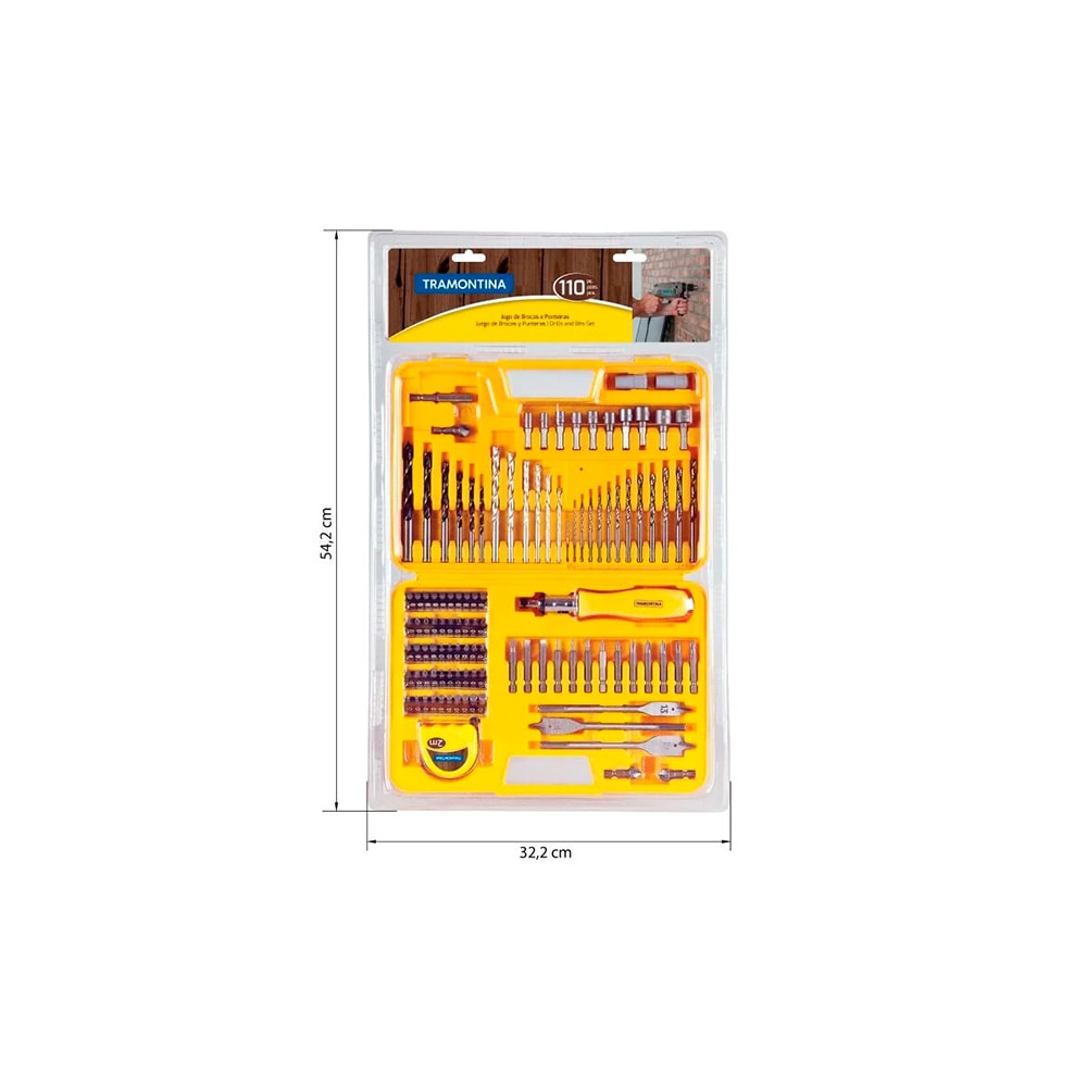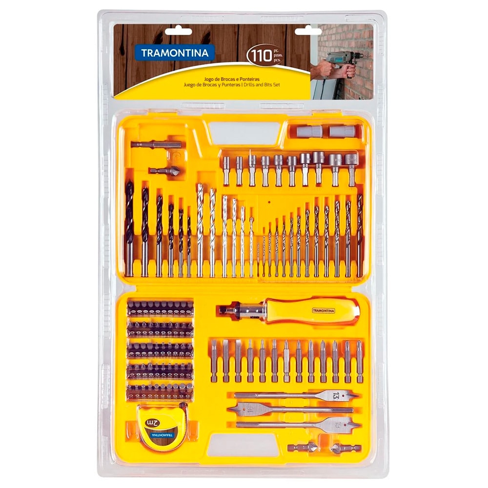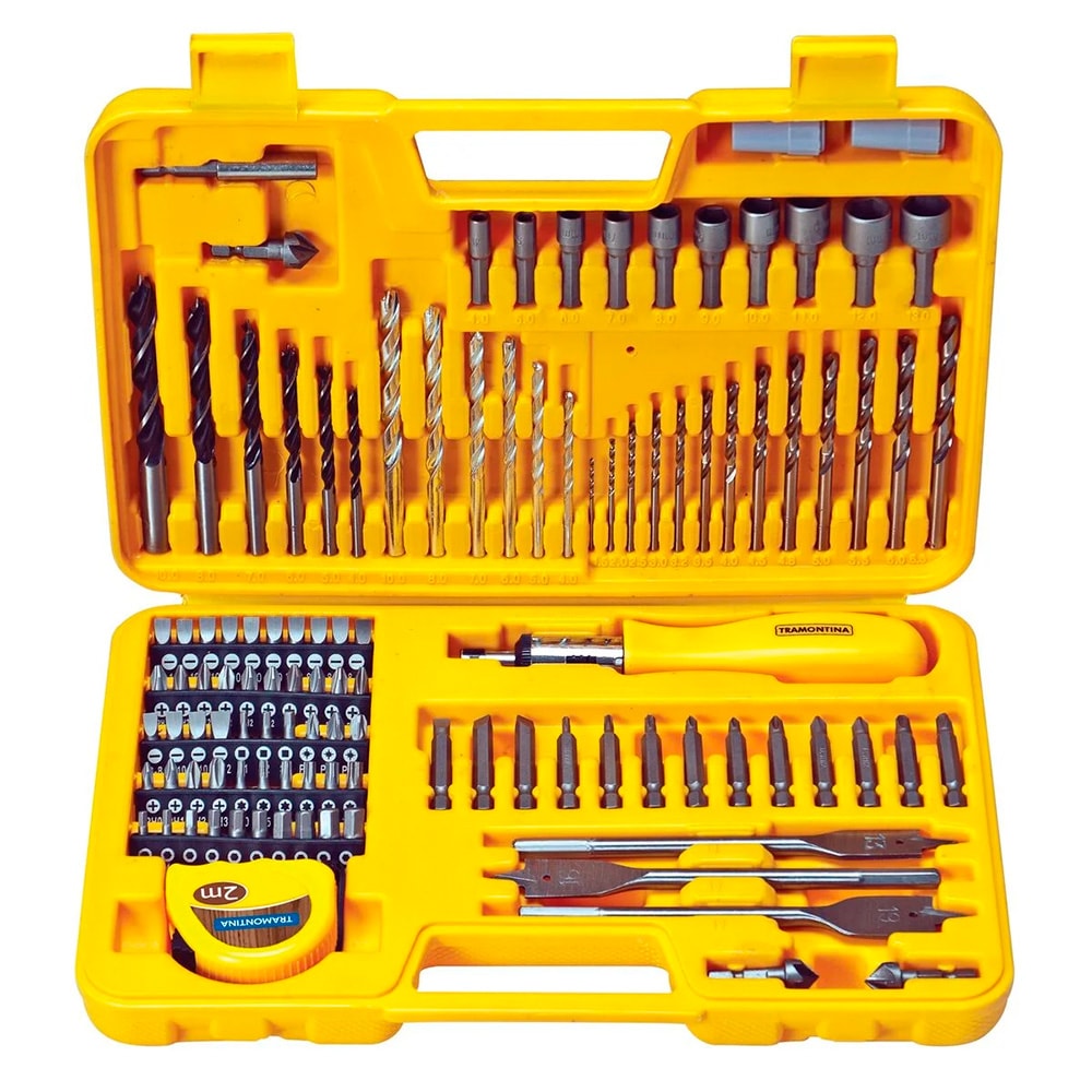 Maleta plástica para facilitar o armazenamento e transporte. Composição variada que oferece versatilidade na utilização do dia-a-dia. As ferramentas são produzidas e testadas conforme normas específicas. Composição: 13 brocas HSS: 1.5, 2, 2.5, 3, 3.2, 3.5, 4, 4.5, 4.8, 5, 5.5, 6 e 6.5mm; 6 brocas para madeira: 4, 5, 6, 7, 8 e 10mm; 3 brocas para madeira ponta chata: 13, 16 e 19mm; 6 brocas para concreto: 4, 5, 6, 7, 8 e 10mm; 50 ponteiras com comprimento 25mm sendo 3 ponteiras cruzadas tipo pozidrive tamanhos PZ1, PZ2 e PZ3; 6 ponteiras tipo trafix tamanhos T10, T15, T20, T25, T27 e T30; 14 ponteiras ponta cruzada tamanhos PH0, PH1, PH2 e PH3; 10 ponteiras hexagonais tamanhos 3, 4, 5, 6 e 7mm; 3 ponteiras quadradas tamanhos S1, S2 e S3; 14ponteiras ponta chata tamanhos 6, 8, 10 e 12mm; 13 ponteiras com comprimento 50mm sendo 3 ponteiras chatas tamanhos 6, 8 e 10mm; 3 ponteiras tipo trafix T10, T15 e T20; 7 ponteiras tipo fenda cruzada tamanhos PH1, PH2 e PH3; 10 ponteiras tipo soquete tamanhos 4, 5, 6, 7, 8, 9, 10, 11, 12 e 13mm; 3 escareadores; 1 suporte magnético para ponteiras; 1 trena 2m; 1 chave com efeito catraca para as ponteiras; 2 guias para ponteiras; maleta plástica.