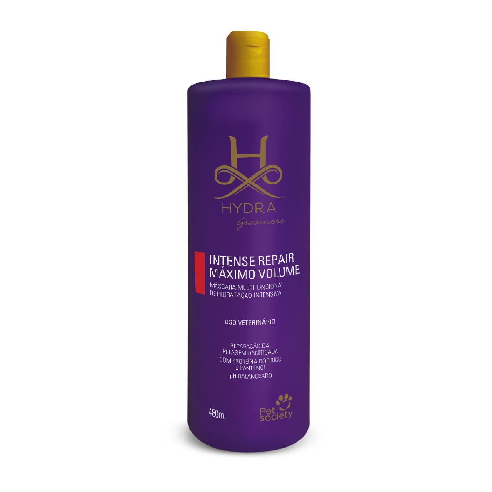 Mantenha os pelos do seu pet sempre impecáveis, volumosos e radiantes com a Máscara Hydra Intense Repair Máximo Volume da Pet Society!