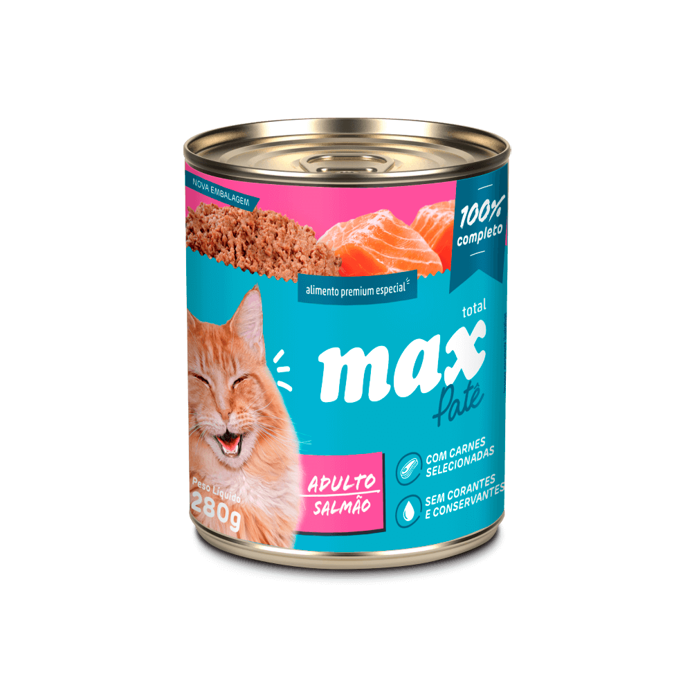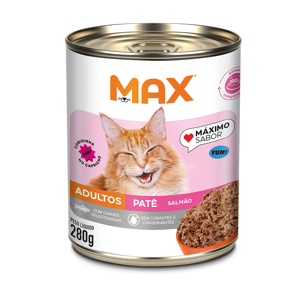 O patê Premium Especial Max Cat, Adulto, sabor Salmão é um alimento livre de corantes, conservantes, transgênicos e glúten. A opção mais saborosa e saudável para uma refeição 100% completa e balanceada para o seu gato. Feito com carnes selecionadas de salmão é enriquecido com taurina e colágeno natural. Leva em sua composição batata doce, beterraba e cenoura, além disso possui tripolifosfato de sódio que reduz a formação do tártaro e zeolita o mineral que auxilia na redução do odor e volume das fezes. Pode ser servido como agrado, misturado a ração. Fresco e saboroso como só você faria!