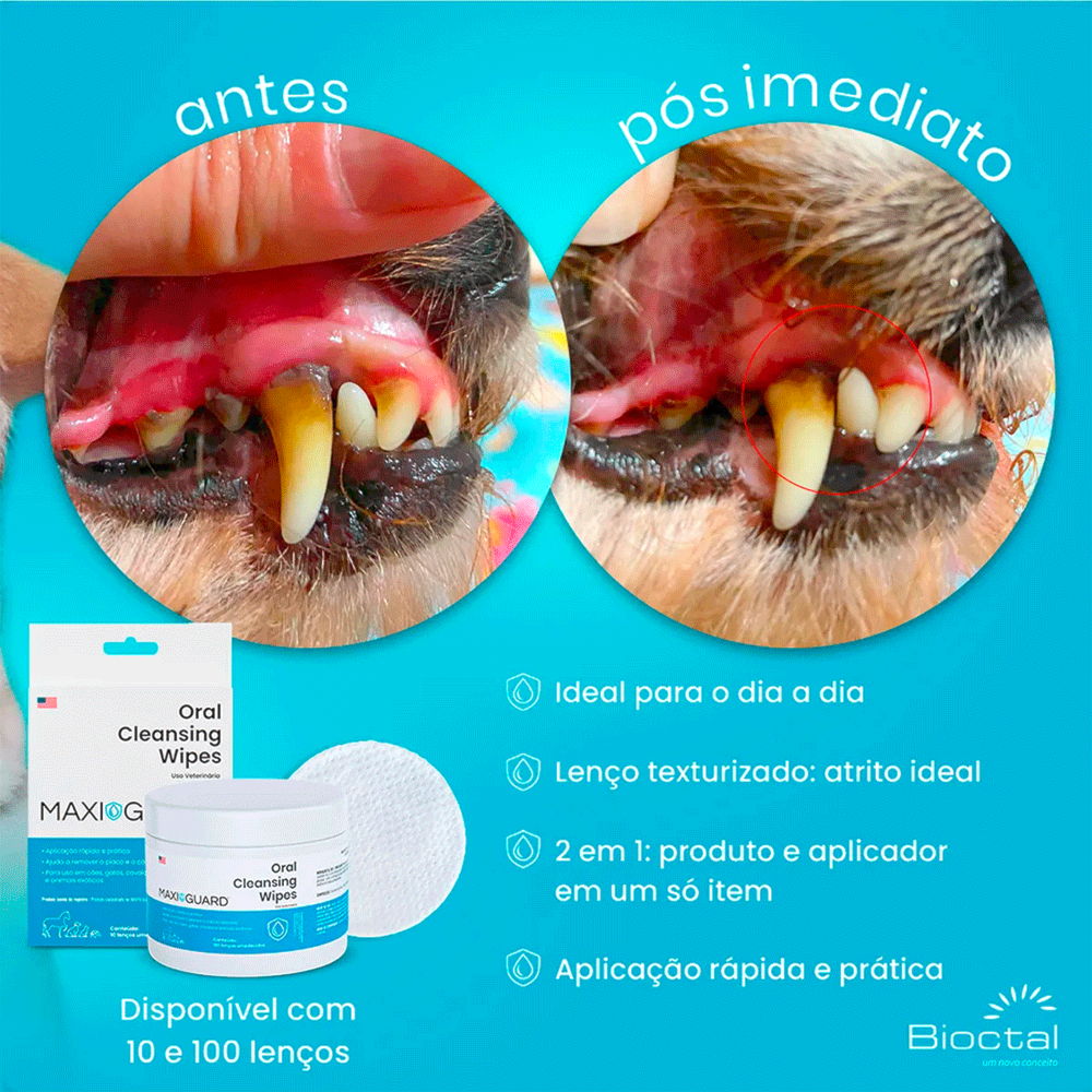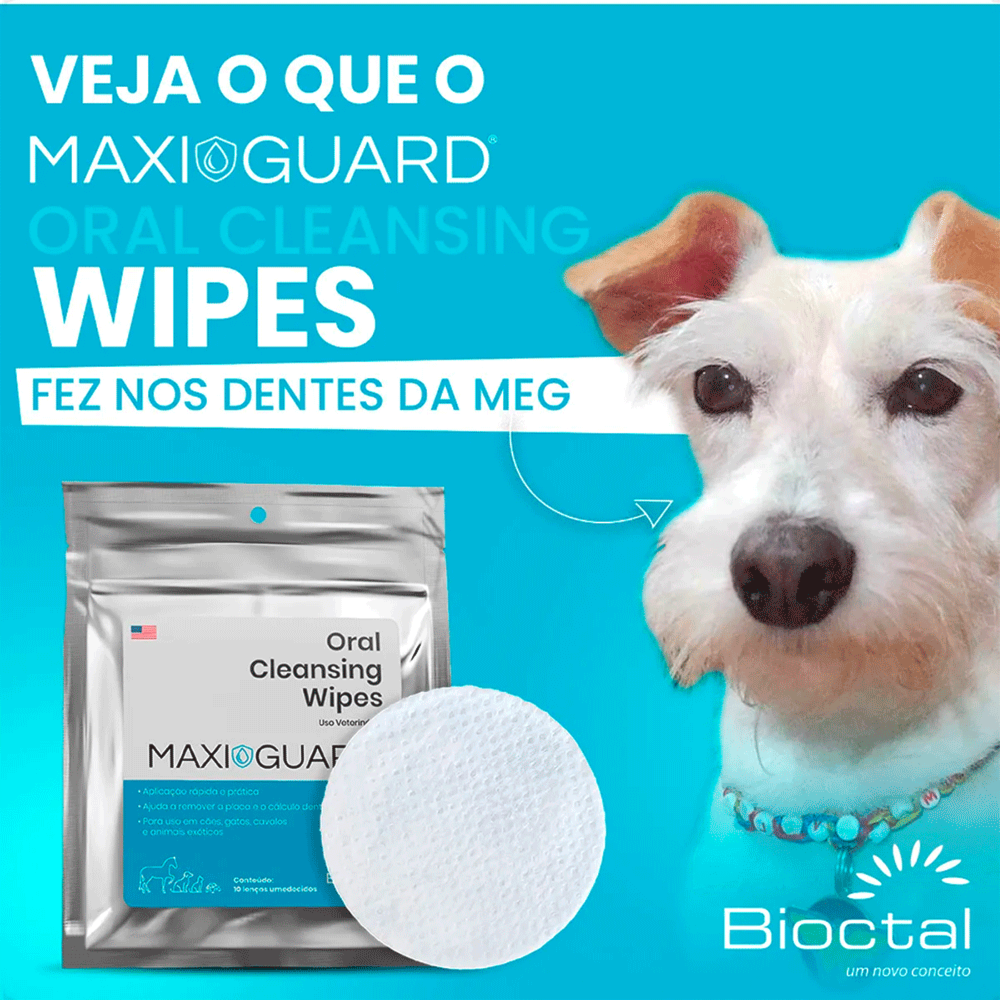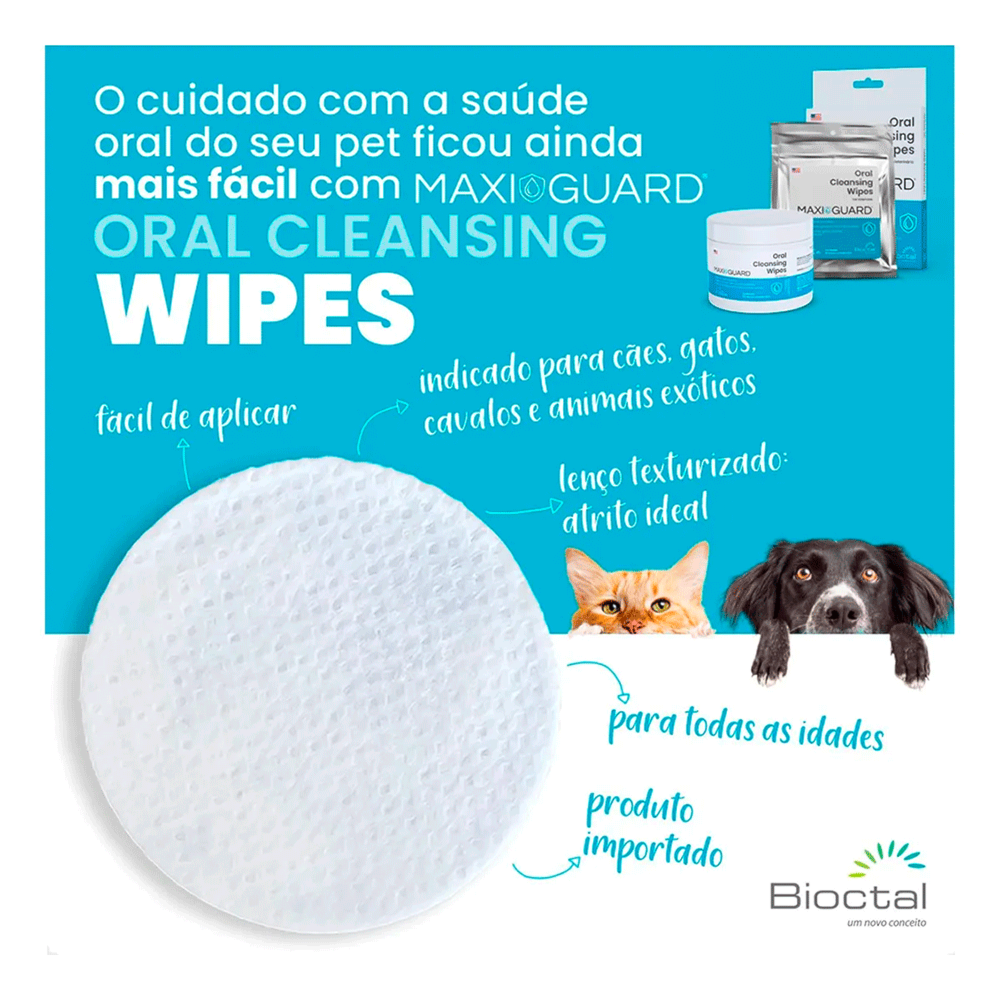 MAXI/GUARD® Oral Cleansing Wipes foi desenvolvido para facilitar os cuidados com a saúde bucal de cães e gatos, oferecendo uma alternativa prática e eficiente à escovação tradicional. Recomendado por veterinários, o produto promove a higienização dos dentes e gengivas, ajudando a controlar o mau hálito e a prevenir o acúmulo de placa bacteriana.