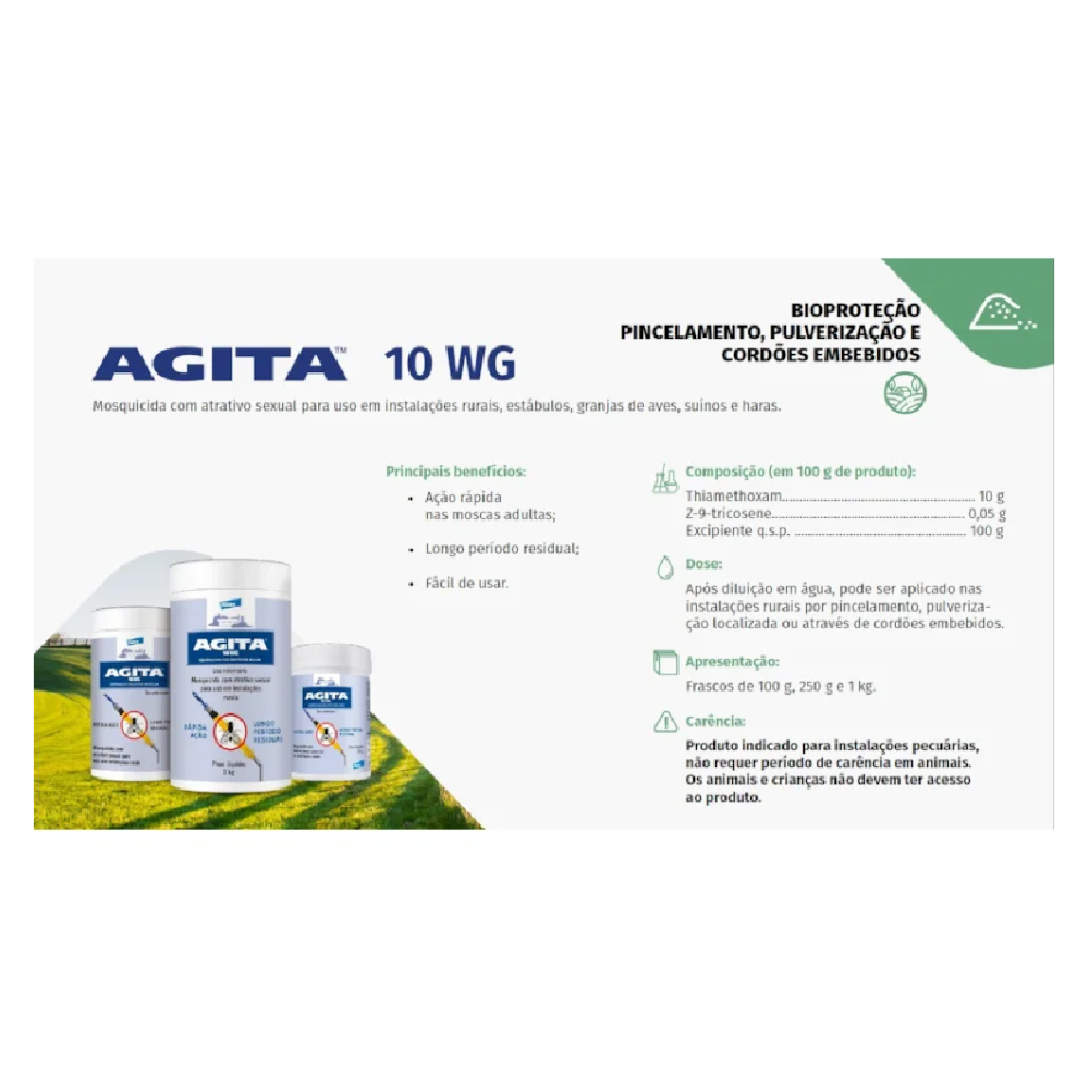 O Agita 10WG é um mosquicida completo e eficiente, indicado para o controle de moscas em diversas situações. Sua ação rápida, efeito residual e segurança fazem dele uma excelente opção para proteger seu ambiente e garantir a saúde de seus animais.