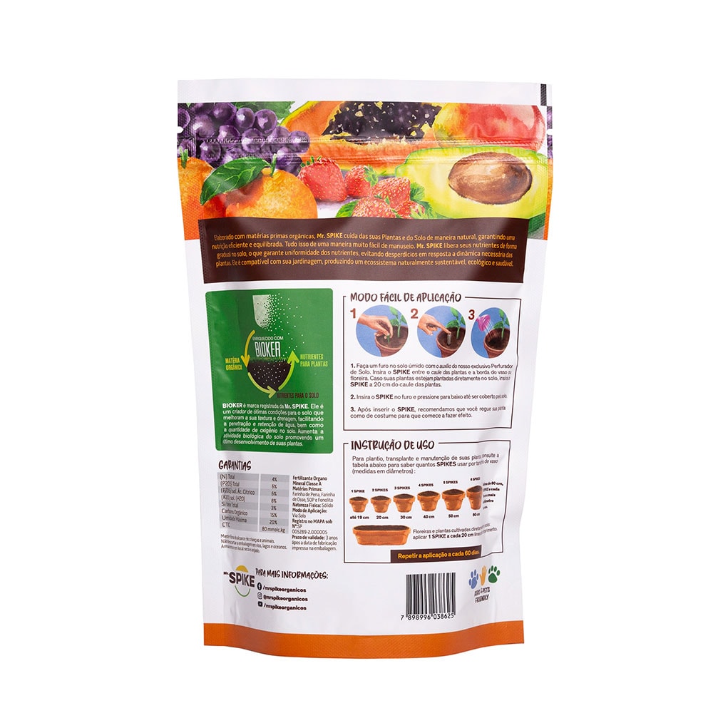 Modo fácil de aplicação: Faça um furo no solo úmido com o auxílio de nosso Perfurador de Solo. Insira o Mr.SPIKE entre o caule das plantas e a borda do vaso ou floreira. Caso suas plantas estejam plantadas diretamente no solo, veja a recomendação no verso da embalagem. Insira o Mr.SPIKE em cada furo e pressione para baixo até ser coberto pelo solo. Após inserir o Mr.SPIKE, recomendamos que você regue sua planta como de costume para que os nutrientes já comecem a fazer efeito.