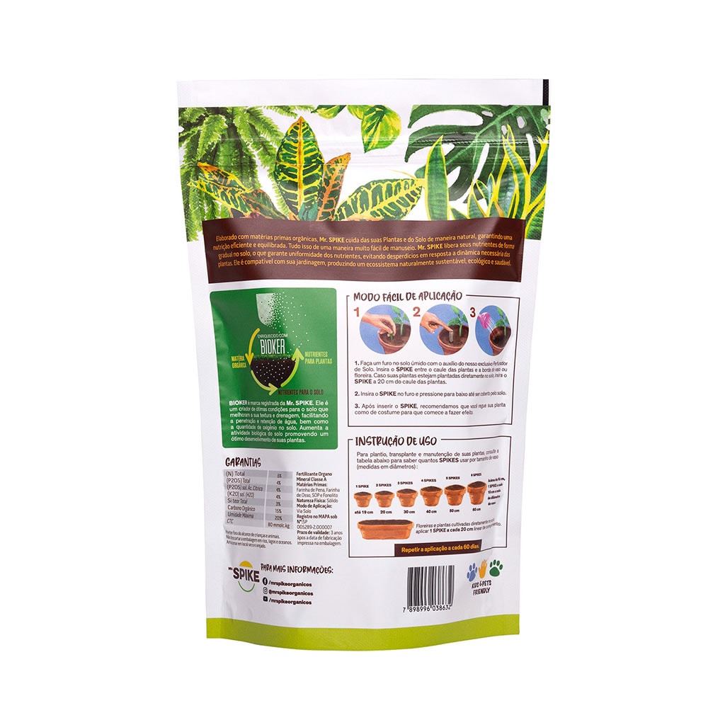 Modo fácil de aplicação: Faça um furo no solo úmido com o auxílio de nosso Perfurador de Solo. Insira o Mr.SPIKE entre o caule das plantas e a borda do vaso ou floreira. Caso suas plantas estejam plantadas diretamente no solo, veja a recomendação no verso da embalagem. Insira o Mr.SPIKE em cada furo e pressione para baixo até ser coberto pelo solo. Após inserir o Mr.SPIKE, recomendamos que você regue sua planta como de costume para que os nutrientes já comecem a fazer efeito.