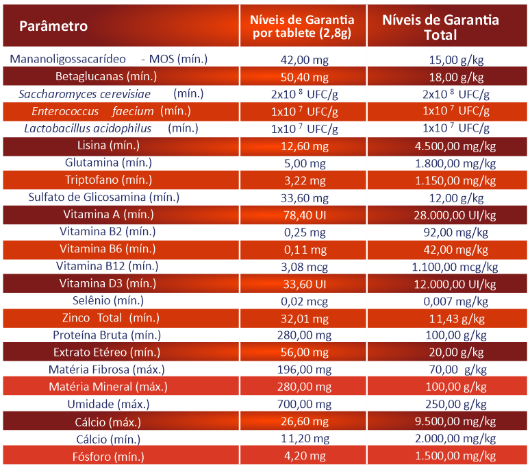 MOS e Betaglucanas (parede de levedura), plasma desidratado de suíno, probióticos (Enterococcus faecium, Lactobacillus acidophilus), spirulina, aminoácidos essenciais, vitaminas A, B2, B6, B12, D3, minerais quelatados (selênio e zinco), glicosamina e outros ingredientes funcionais que complementam a nutrição diária.