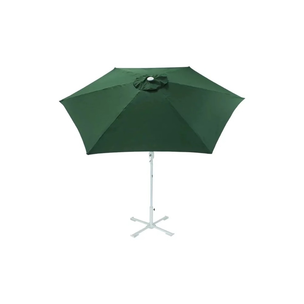 Quanto ao material de produção, sua estrutura é feita em alumínio, haste de aço e tecido em poliéster oxford com revestimento em PVC. O ombrelone Milano 300 não inclui base e está disponível em diversas cores.