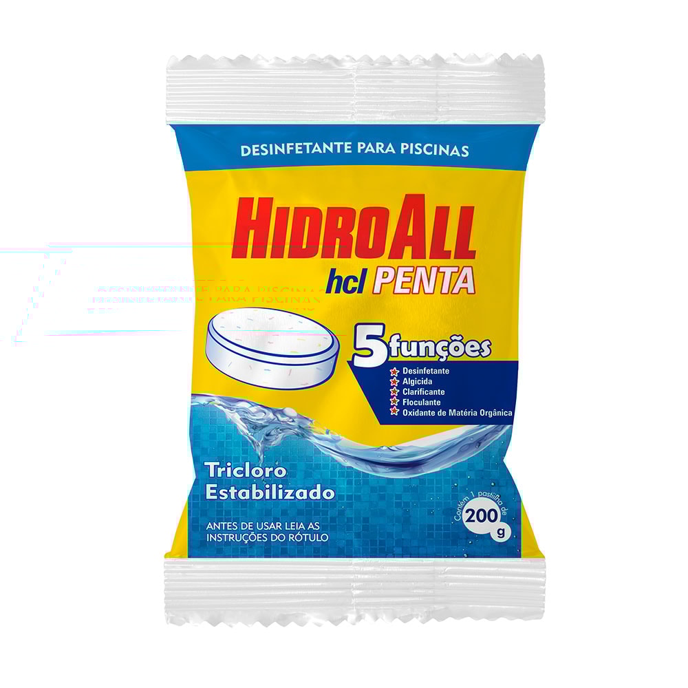O HCL Tablete Pastilha de Cloro Penta com 5 Funções é um produto em forma de tabletes, composto por Tricloro Orgânico aditivado com clarificante, algicida, floculante e eliminador de matéria orgânica. Este produto contém estabilizador em sua fórmula que protege o cloro livre da água evitando a perda causada pelos raios solares.