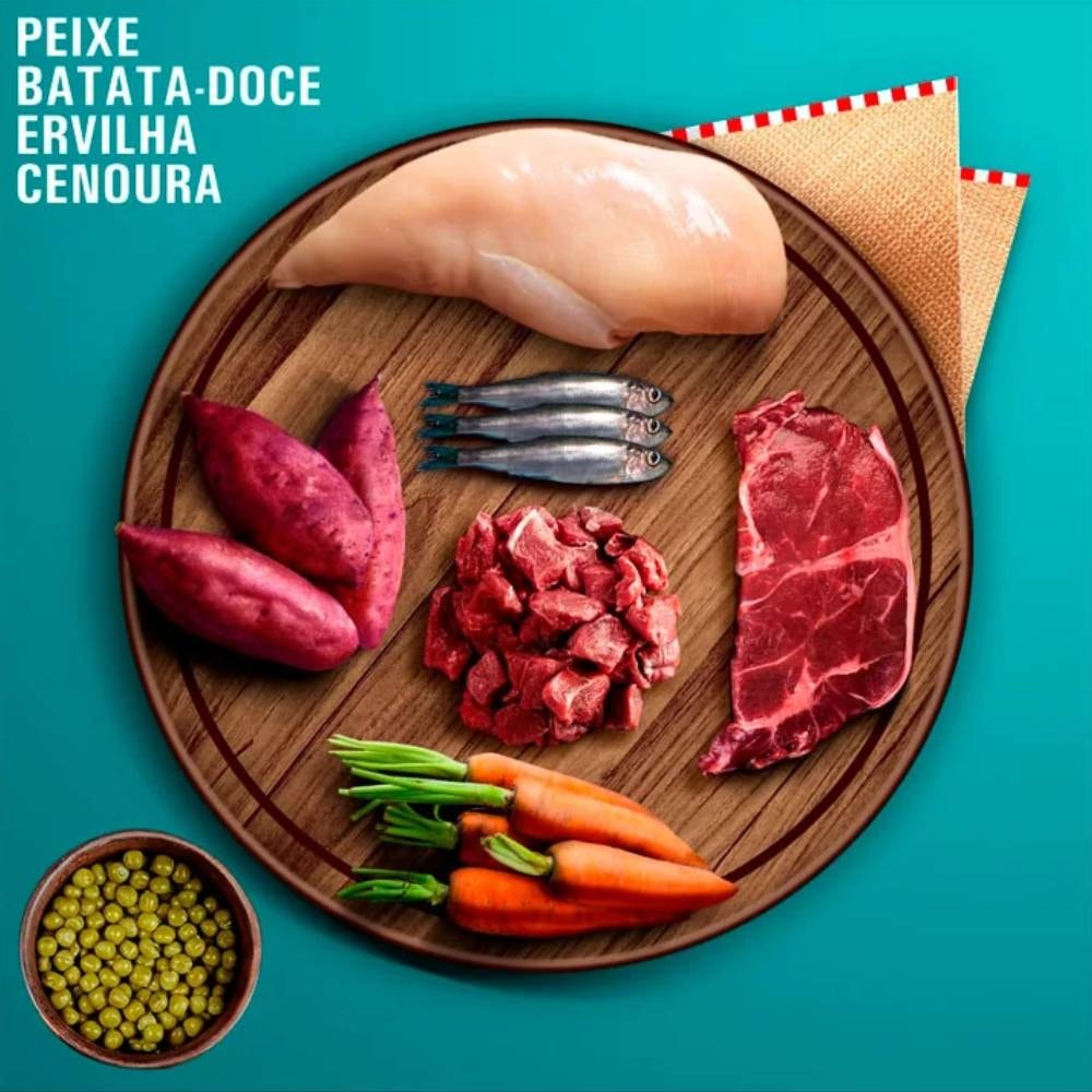Carne Bovina, Carne de Frango, Miúdos de Aves, Sardinha, Água, Batata Doce, Cenoura, Ervilha, Fécula de Mandioca, Zeolíta, Espessante, Gelificante, Px. Vit. (Vitamina A, Vitamina D3, Vitamina B1, Vitamina B2, Niacina, Ácido Pantotênico, Vitamina B6, Ácido Fólico, Vitamina B12, Biotina, Colina, Vitamina E) Px Min. Transquelatado (Ferro, Iodo, Selênio, Manganês, Cobre e Zinco).