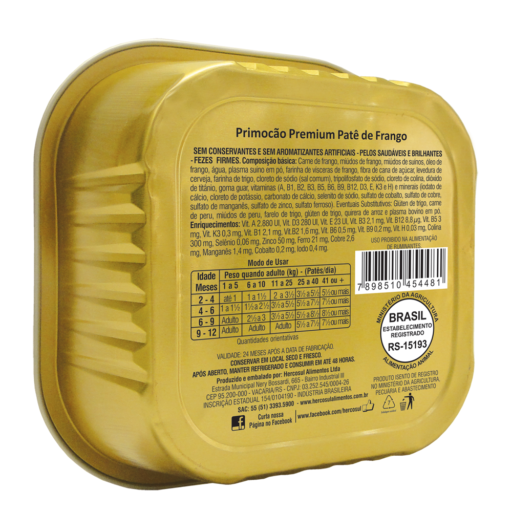 O Primocão Premium Junior Patê de Frango para Cães Filhotes 300g faz parte da linha de alimentos úmidos da marca Hercosul. Esses alimentos possuem alta concentração de nutrientes que são essenciais para os cães, resultando em um melhor balanceamento de proteínas, gorduras e carboidratos. Esse fator é importante para melhorar a saúde e a longevidade dos nossos pets.