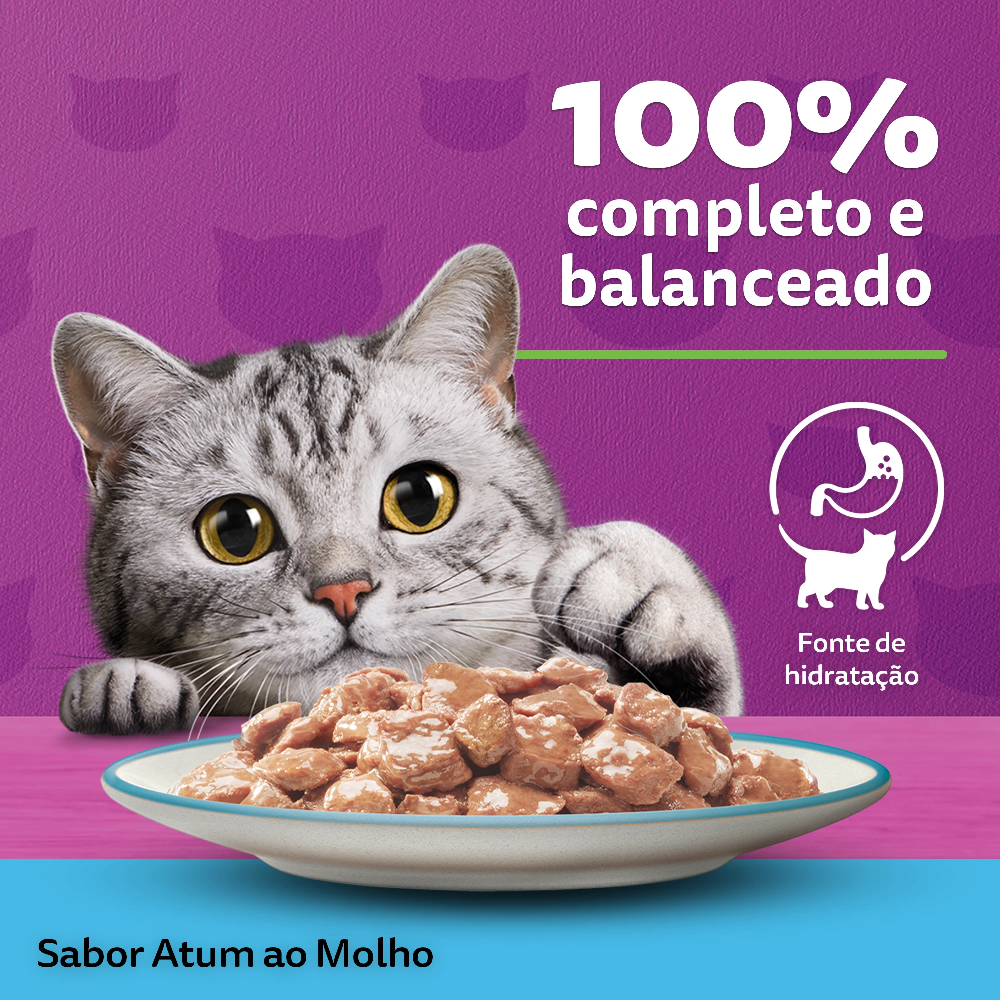 O WHISKAS® Lata Pedaços ao Molho Sabor Atum é um alimento 100% completo e balanceado, perfeito para consumo diário, pois não possui aroma artificial e conservantes, proporcionando também ótima qualidade de fezes. Além disso, previne o felino de infecções urinárias.