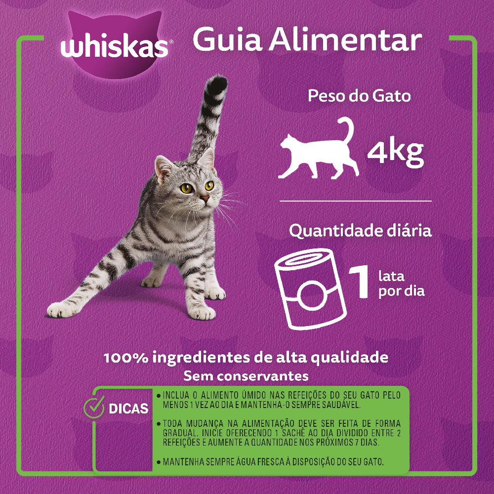 Sirva 1 lata por dia para gatos adultos de até 4kg. Adapte a quantidade de acordo com a idade e nível de atividade do seu gato. Cada Lata de WHISKAS® Patê equivale a 63g de WHISKAS® Seco Adulto.