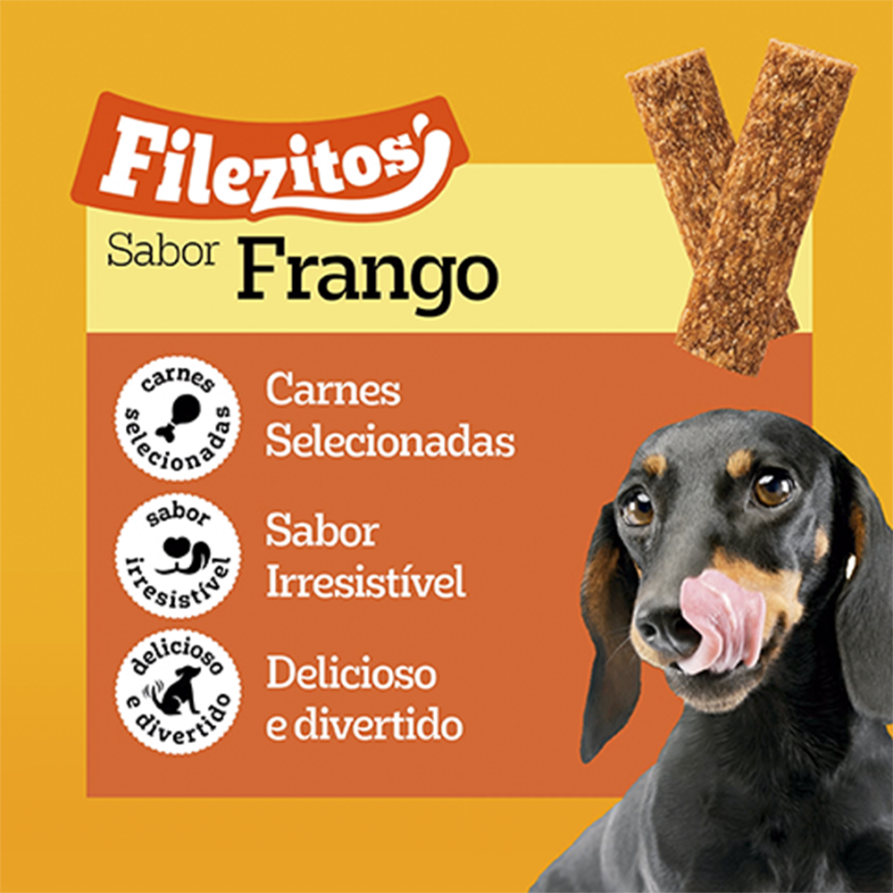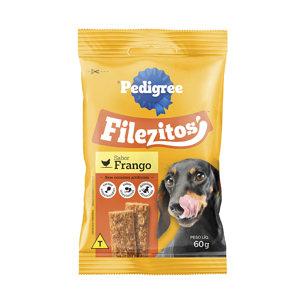 O Pedigree® Filezitos™ Sabor Frango é o petisco ideal para deixar qualquer momento mais especial. São bifinhos macios e suculentos, com textura que os cães adoram mastigar e sabor irresistível de frango.