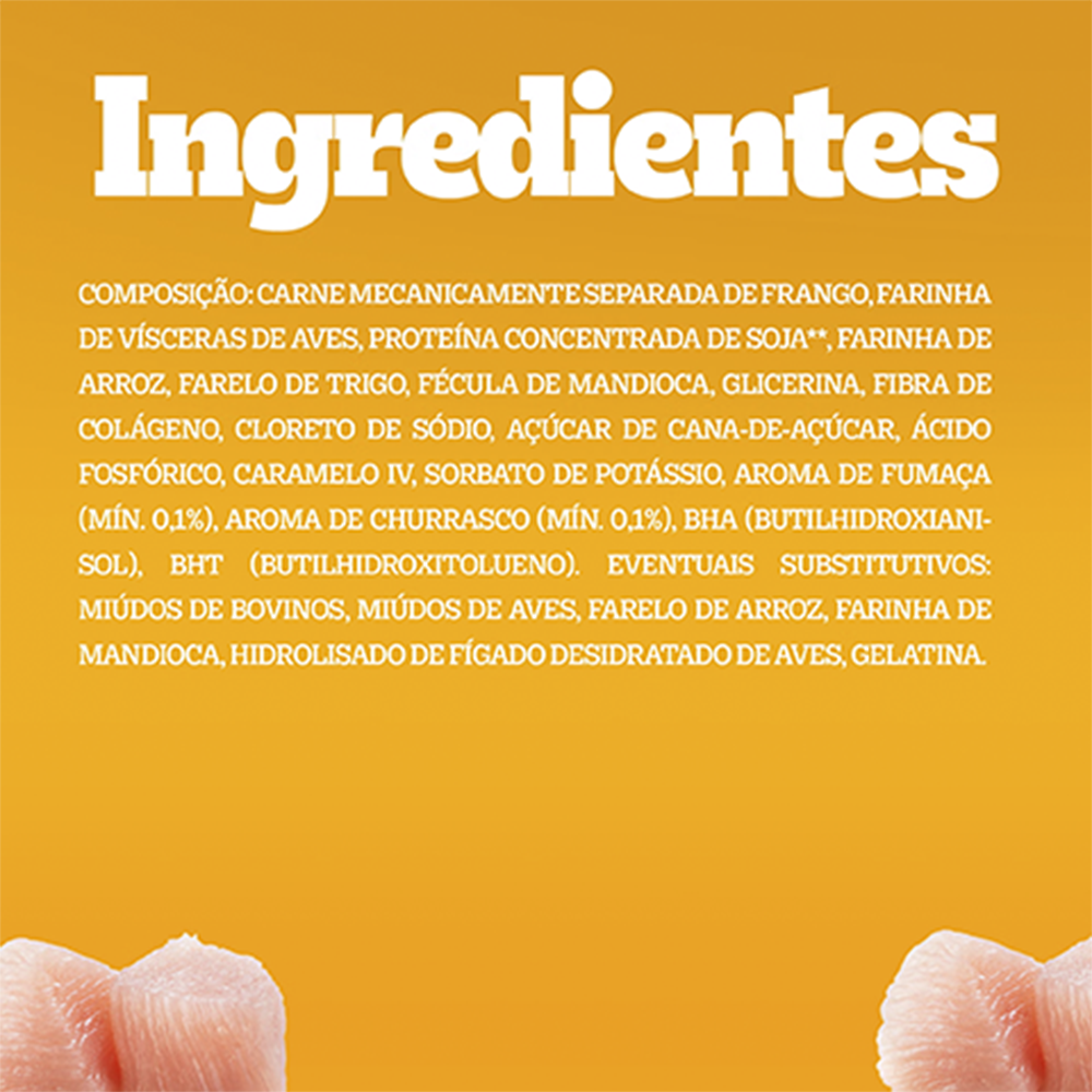 Carne mecanicamente separada de frango, farinha de vísceras de aves, proteína concentrada de soja, farinha de arroz, farelo de trigo, fécula de mandioca, glicerina, fibra de colágeno, cloreto de sódio, açúcar de cana-de-açúcar, ácido fosfórico, sorbato de potássio, aroma de fumaça, aroma de frango, BHA e BHT.