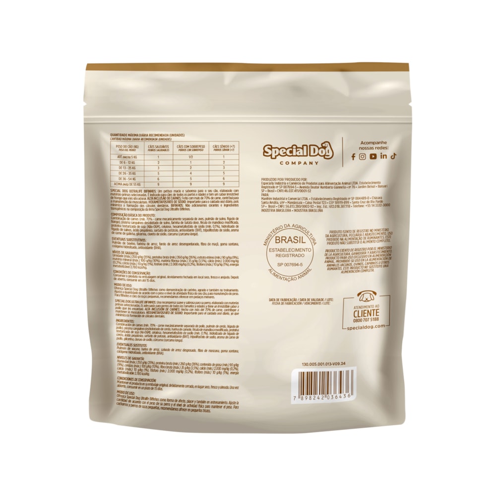 Os Bifinhos Special Dog Ultralife Carne foram desenvolvidos por veterinários para oferecer um petisco nutritivo, saboroso e seguro para o seu cão. Com alta inclusão de carnes (mín. 70%) e zero adição de corantes e transgênicos, é a escolha ideal para quem busca um mimo saudável e de qualidade premium para o pet.