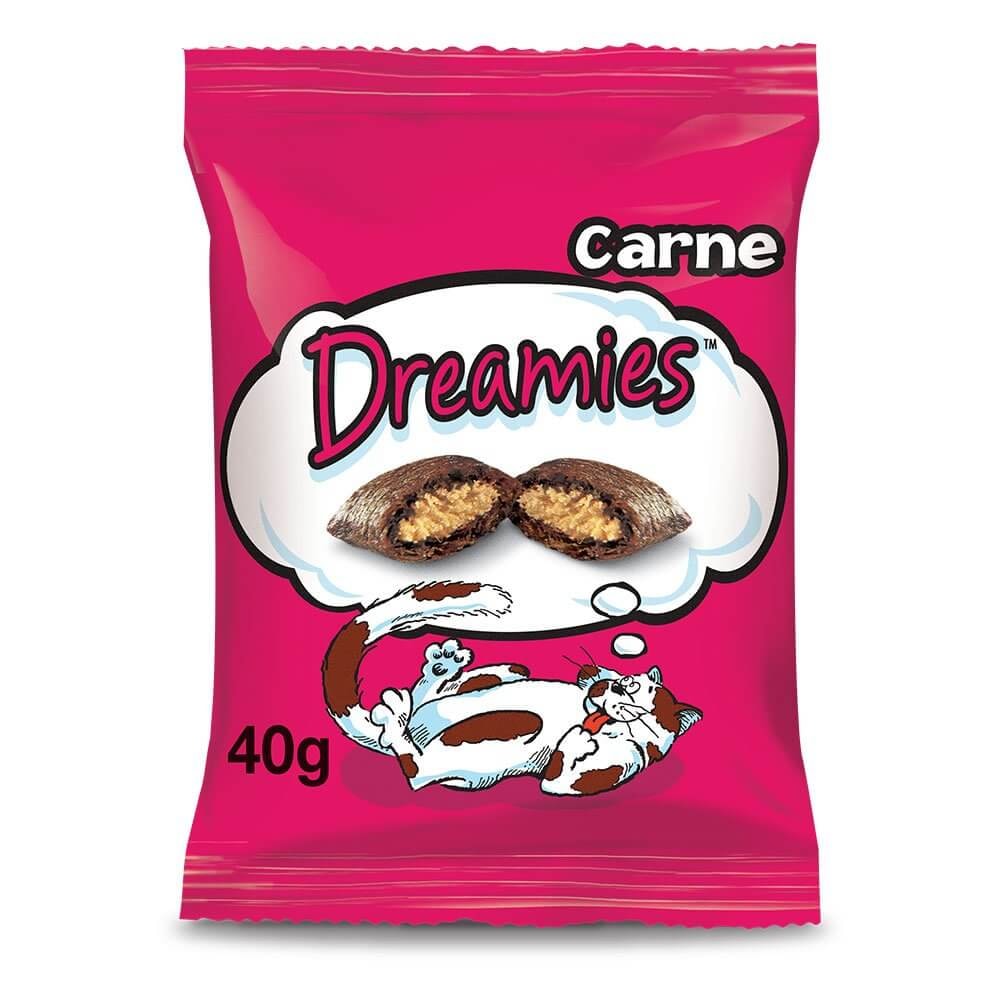 Os Petisco Dreamies para Gatos Adultos e Filhotes Sabor Carnesão petiscos crocantes por fora e macios por dentro, para toda hora. Eles são indicados para gatos de todas as raças e idades. A embalagem contém 40g.