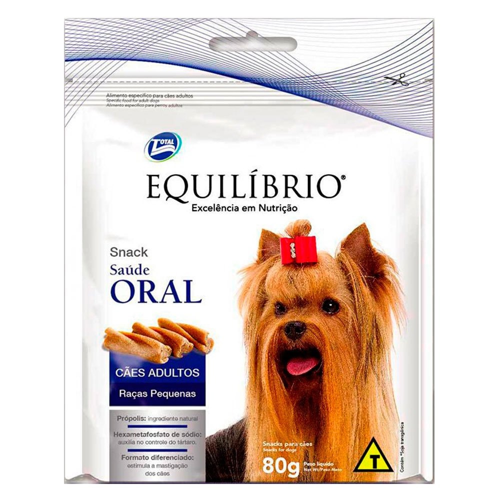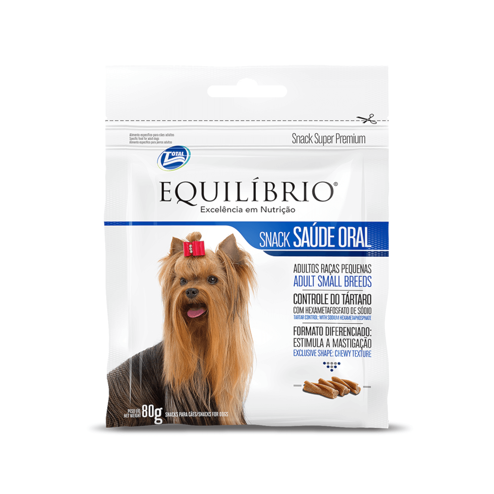 O Petisco Equilíbrio Snacks Saúde Oral é indicado para cães adultos de raças pequenas composto de própolis como ingrediente natural e hexametafosfato de sódio que auxilia no controle do tártaro. Seu formato diferenciado também estimula a mastigação.