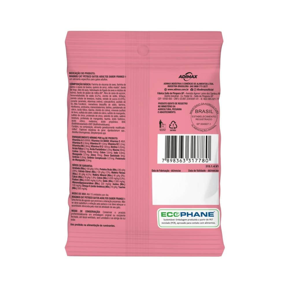 Detalhes do Produto MAGNUS CAT PETISCO GATOS ADULTOS SABOR FRANGO é uma forma de agrado que promove a interação prazerosa. Não se deve substituir a refeição pelo petisco e se deve adequar a quantidade oferecida pelo nível de atividade de seu gato.