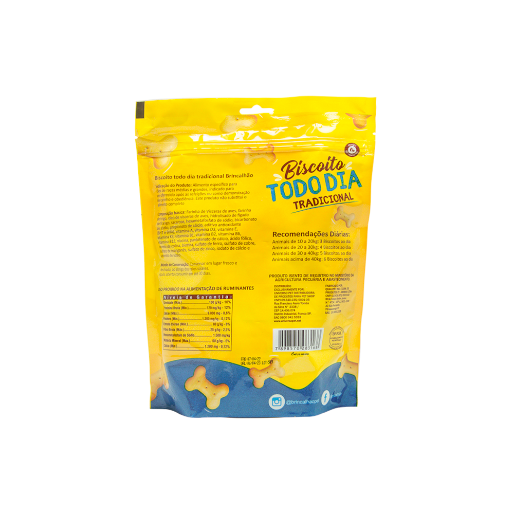 O Petisco para cachorro Brincalhão Pet Biscoito Todo Dia Original é uma opção deliciosa e saudável para o seu pet. Com um sabor irresistível, ele é perfeito para ser oferecido como recompensa durante o treinamento ou como um agrado no dia a dia.
