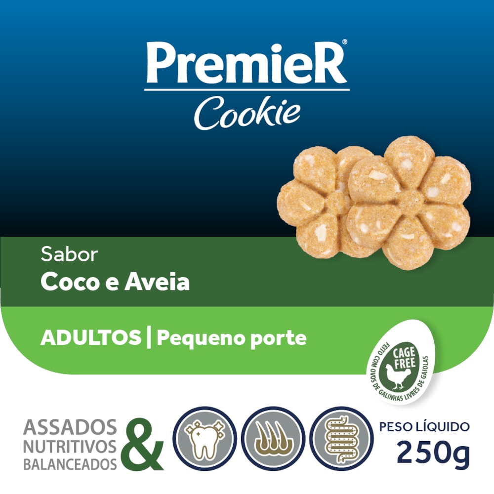 Indicado para cães adultos de pequeno porte e contém todos os benefícios da linha PremieR Cookies aliados à exclusiva combinação do coco e aveia, ingredientes saudáveis e que promovem ainda mais sabor aos biscoitos. Outra exclusividade deste alimento são os ovos utilizados em sua formulação, provenientes do sistema de criação Cage Free, no qual as aves possuem liberdade de movimento, com acesso a ninhos, permitindo assim sua total locomoção.