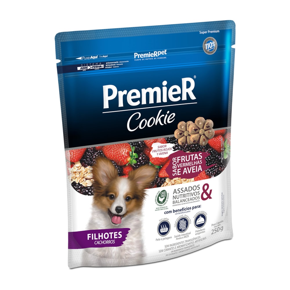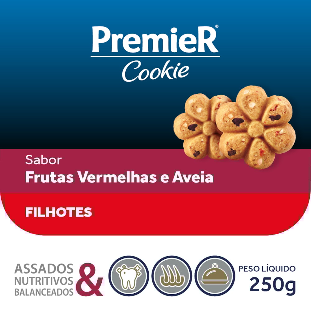 Com intuito de retribuir de forma divertida o amor incondicional e a amizade que os cães nos oferecem, a PremieRpet® criou Premier Cookie, um biscoito que reúne qualidade, saúde e sabor e é diferente de todos os produtos encontrados até hoje no mercado. Premier Cookie é assado, saudável e nutritivo. Possui ingredientes rigorosamente selecionados e satisfação comprovada. PremieR Cookie Cães Filhotes Frutas Vermelhas & Aveia é indicado para cães filhotes e contém todos os benefícios da linha PremieR Cookies aliados à exclusiva combinação do morango, amora e aveia, ingredientes saudáveis e que promovem ainda mais sabor aos biscoitos.