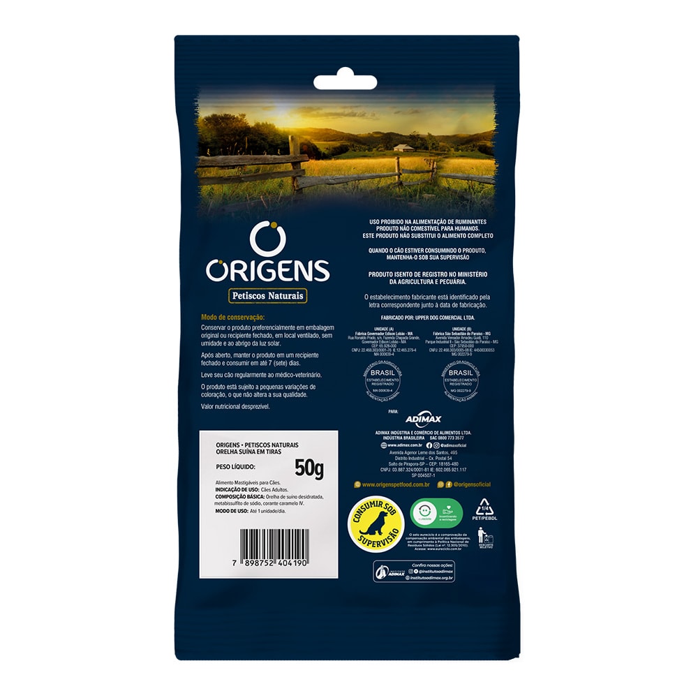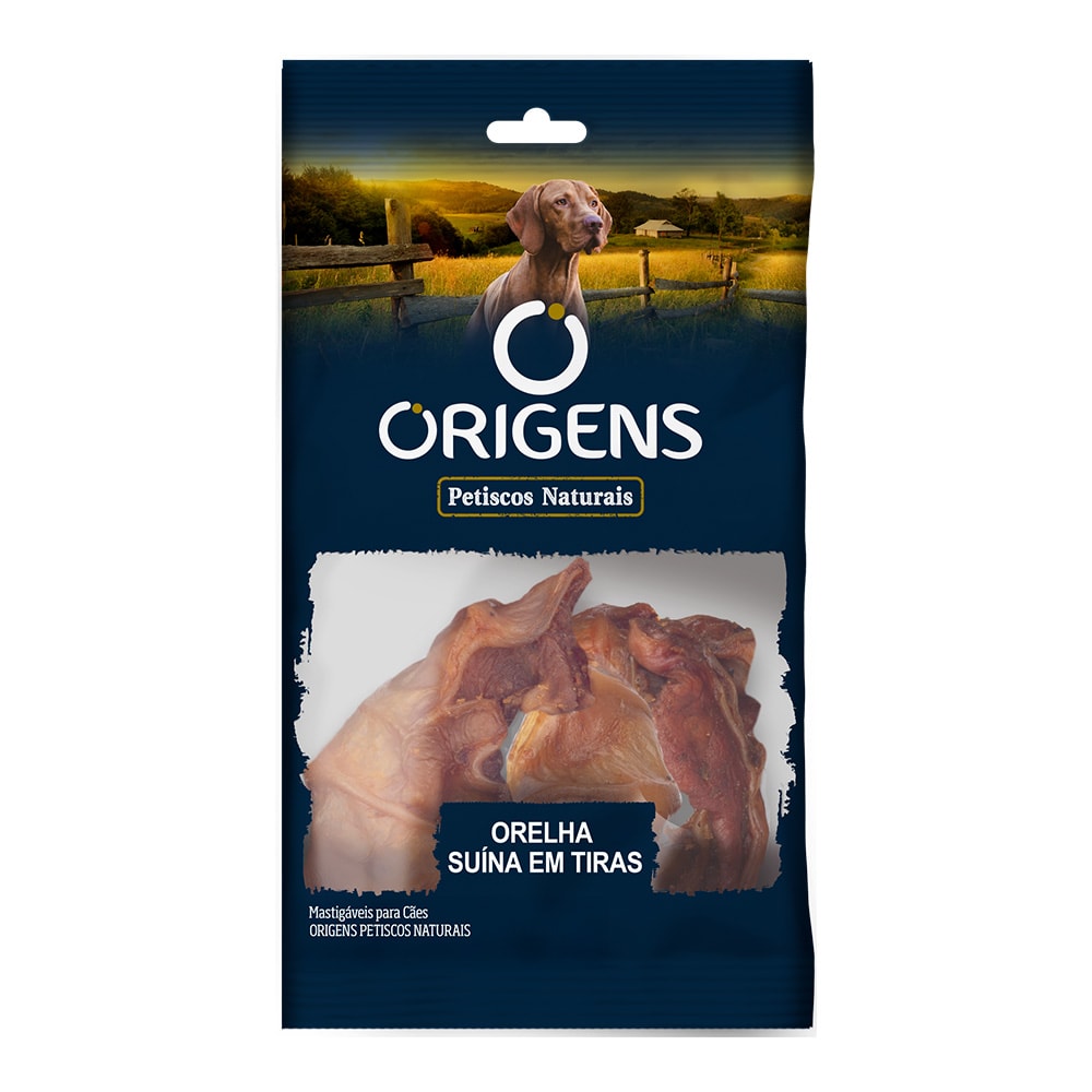 O Petiscos Naturais Origens para Cães Orelha Suína em Tiras 50g é um petisco natural, feito com orelha suína desidratada, perfeito para cães que gostam de mastigar.