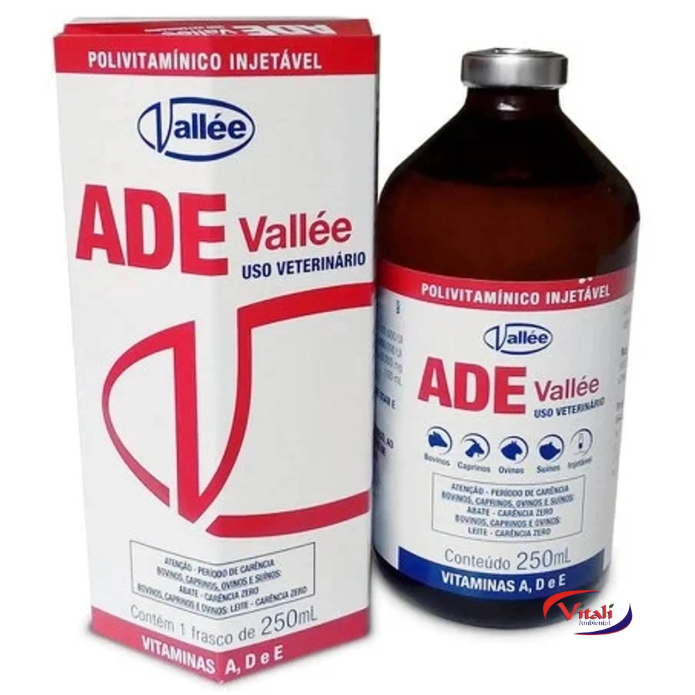 O Polivitamínico Injetável ADE Valleevita 250ml é um suplemento vitamínico especialmente formulado para animais, como bovinos, suínos, ovinos e caprinos. Ele contém uma combinação de vitaminas A, D e E, nutrientes essenciais para a saúde e o bem-estar desses animais.