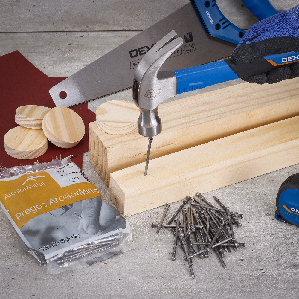 4. Martele com firmeza: Martele com força até que a primeira cabeça esteja totalmente inserida na madeira.