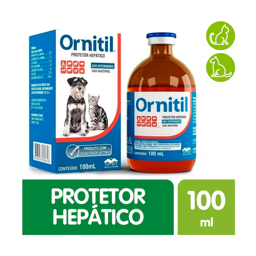 Ornitil é indicado para cães e gatos como auxiliar do metabolismo hepático e tratamento dos estados carenciais dos ingredientes que compõe a fórmula do produto.