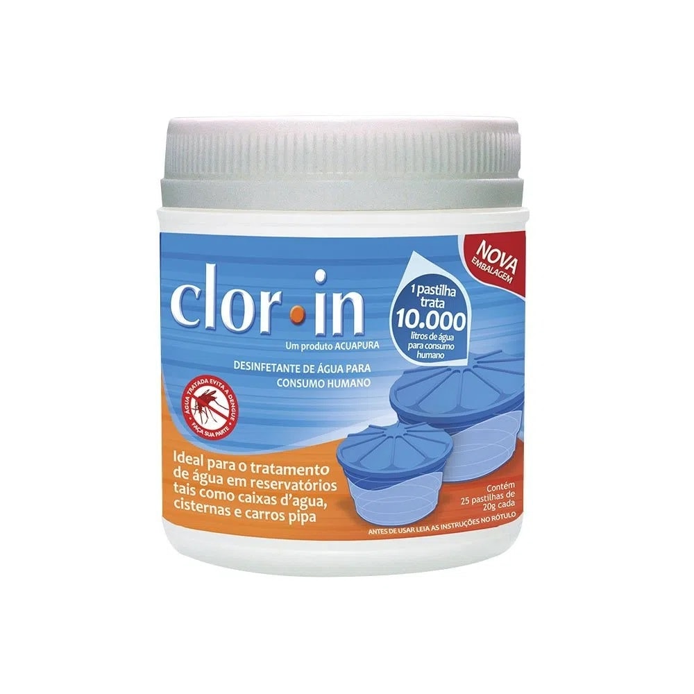 O Clorin purificador de água para consumo humano em forma de pastilhas. Segurança total da qualidade da água de sua casa seja qual for a fonte. Solução definitiva para garantir, de forma eficiente, segura e econômica, a qualidade potável da água consumida em lares e residências, em localidades ou ocasiões onde a qualidade da fonte ou fornecimento for suspeita. Com apenas uma pastilha de 1g é possível tratar 500 litros de água. Para isso, é necessário aguardar 30 minutos após dissolver. O Clorin é composto por: Dicloro-S-Triazinetrione de Sódio, carga e antiaderentes que garantem qualidade e segurança no tratamento de água, seja ela para bebê-la ou usá-la para outros fins.
