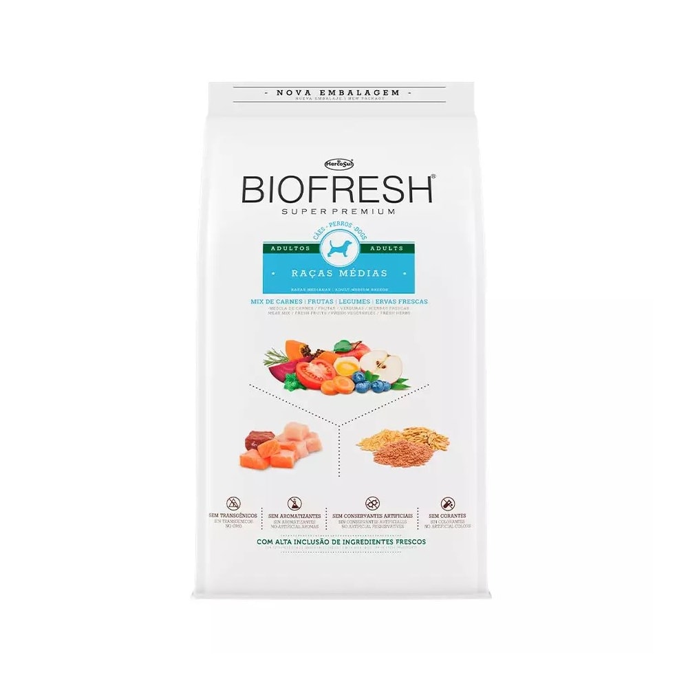 Biofresh Super Premium é inovador e diferente porque possui ALTA INCLUSÃO DE INGREDIENTES REALMENTE FRESCOS, diretamente da natureza. O resultado é um alimento completo e equilibrado que se destaca por elevar a nutrição dos cães de raças médias ao seu mais alto patamar. A TECNOLOGIA Biofresh garante a preservação deste alimento de forma segura e 100% natural, SEM ADIÇÃO DE CONSERVANTES ARTIFICIAIS.