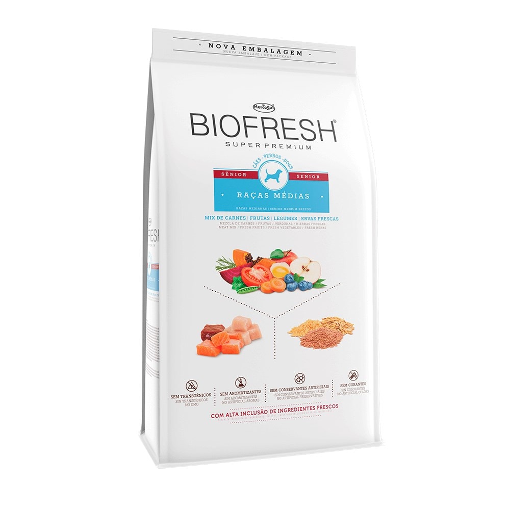 A Ração Biofresh Super Premium é inovador e diferente porque possui ALTA INCLUSÃO DE INGREDIENTES REALMENTE FRESCOS, diretamente da natureza. O resultado é um alimento completo e equilibrado que se destaca por elevar à nutrição dos cães seniores de raças médias a ao seu mais alto patamar. Biofresh Super Premium Sênior ajuda a preservar características muito importantes da juventude tais como a musculatura forte, a agilidade mental e a saúde dos sistemas digestivo, renal e cardíaco. A TECNOLOGIA Biofresh garante a preservação deste alimento de forma segura e 100% natural, SEM ADIÇÃO DE CONSERVANTES ARTIFICIAIS.