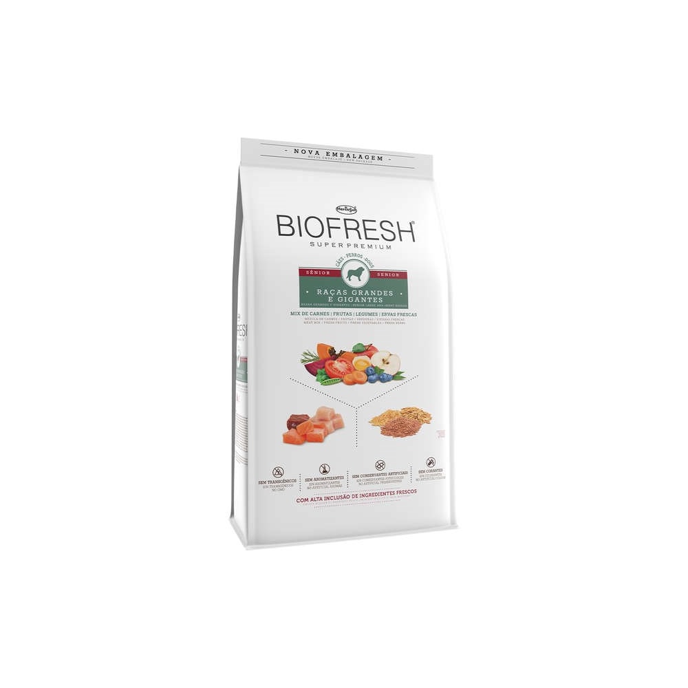 Biofresh Super Premium é inovador e diferente porque possui alta inclusão de ingredientes realmente frescos, diretamente da natureza. O resultado é um alimento completo e equilibrado que se destaca por elevar à nutrição dos cães seniores de raças grandes e gigantes ao seu mais alto patamar. Biofresh Super Premium Sênior ajuda a preservar características muito importantes da juventude tais como a musculatura forte, a agilidade mental e a saúde dos sistemas digestivo, renal e cardíaco. A tecnologia Biofresh garante a preservação deste alimento de forma segura e 100% natural, sem adição de conservantes artificiais.